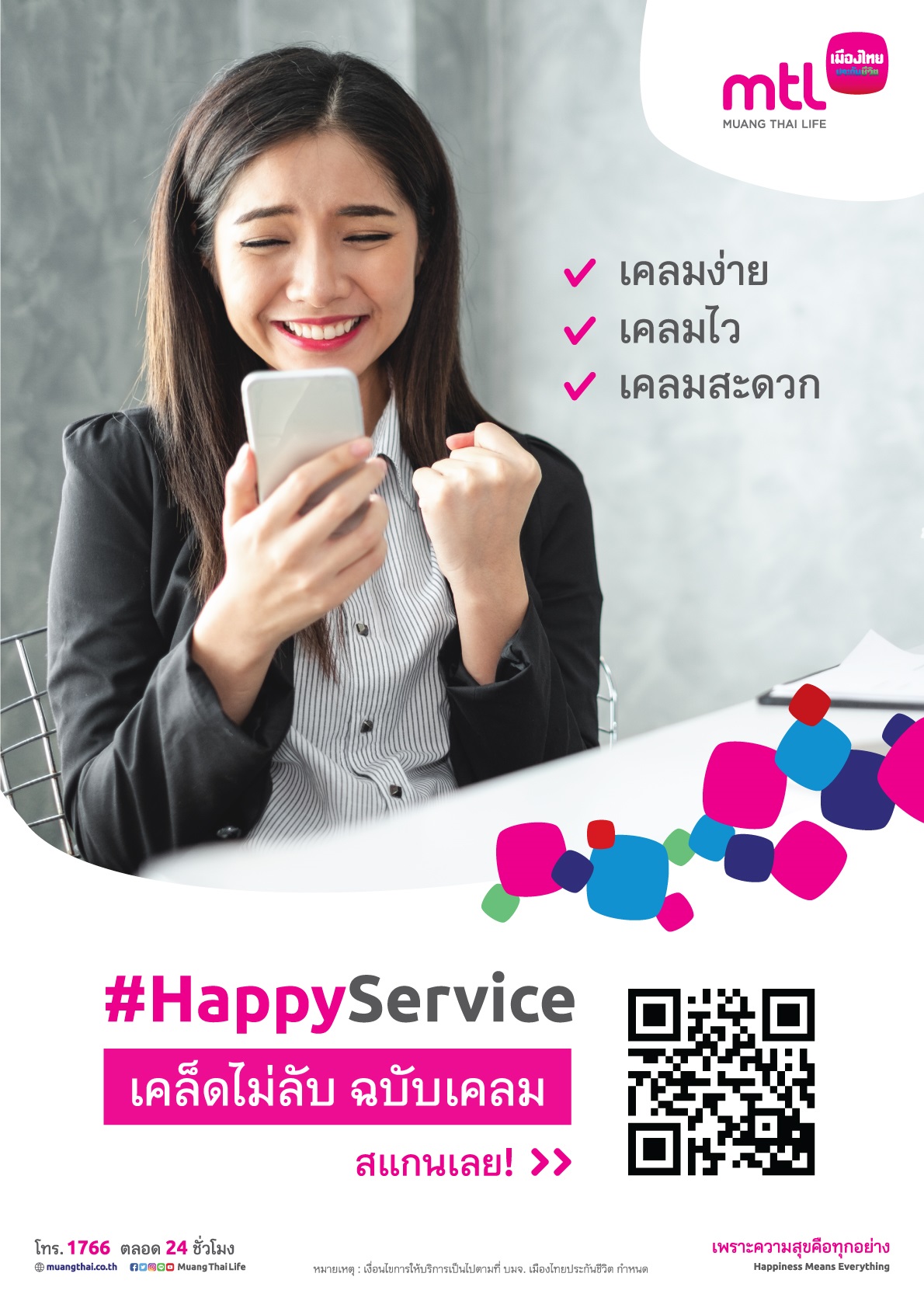 นอกจากนี้ยังมี “บริการรับเงินผลประโยชน์ตามกรมธรรม์ผ่านบัญชีธนาคาร” (Media Clearing) โดยไม่ต้องเสียเวลารอเช็คเงินสด ลูกค้าสามารถทำรายการได้ด้วยตัวเอง เพียงสมัครเมนู Media Clearing ผ่าน MTL Smile Application หรือทางเว็บไซต์ Smileservice.muangthai.co.th