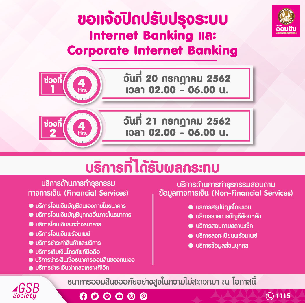 19 กรกฎาคม 2562 : ดร.ชาติชาย พยุหนาวีชัย ผู้อำนวยการธนาคารออมสิน เปิดเผยว่า ธนาคารออมสินมีการปิดปรับปรุงระบบ Internet Banking (IB) และระบบ Corporate Internet Banking (CIB) ในวันศุกร์ที่ 19 กรกฎาคม 2562 ตั้งแต่เวลา 23.00 น. ถึงวันอาทิตย์ที่ 21 กรกฎาคม 2562 เวลา 06.00 น. ซึ่งจะส่งผลให้ลูกค้าไม่สามารถใช้บริการ Internet Banking ได้ใน 2 ช่วงเวลา คือ ในวันเสาร์ที่ 20 และวันอาทิตย์ที่ 21 กรกฎาคม 2562 ระหว่างเวลา 02.00 – 06.00 น.
