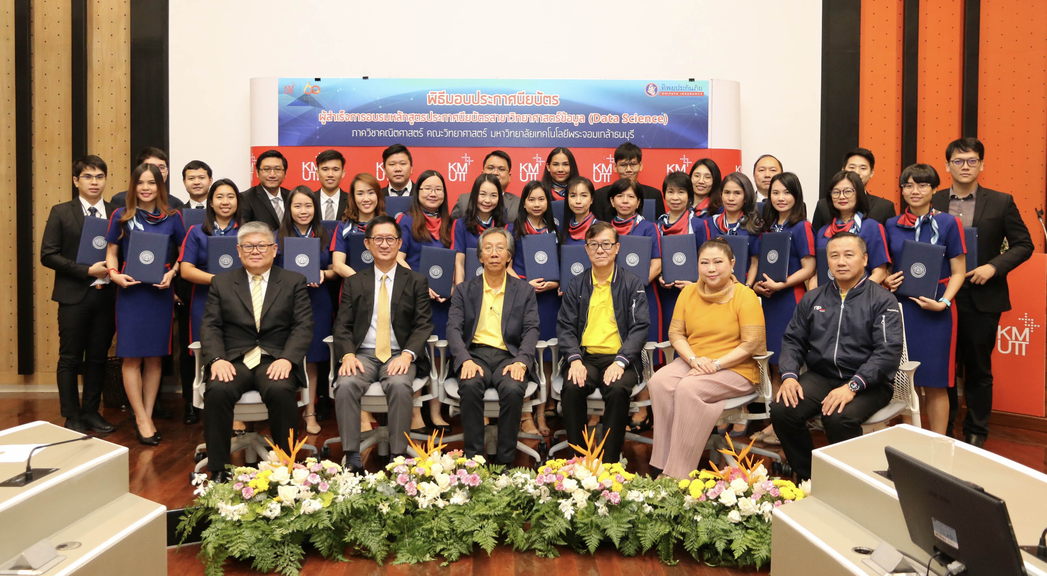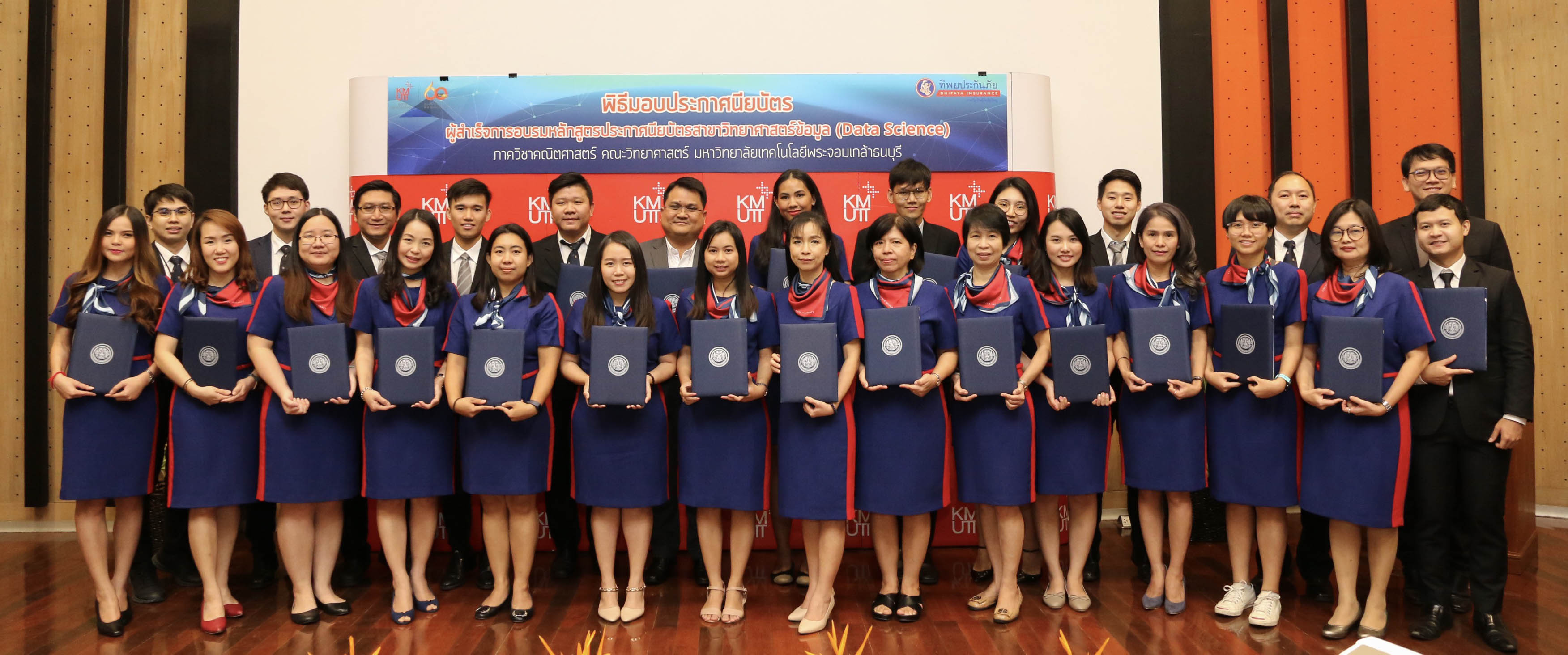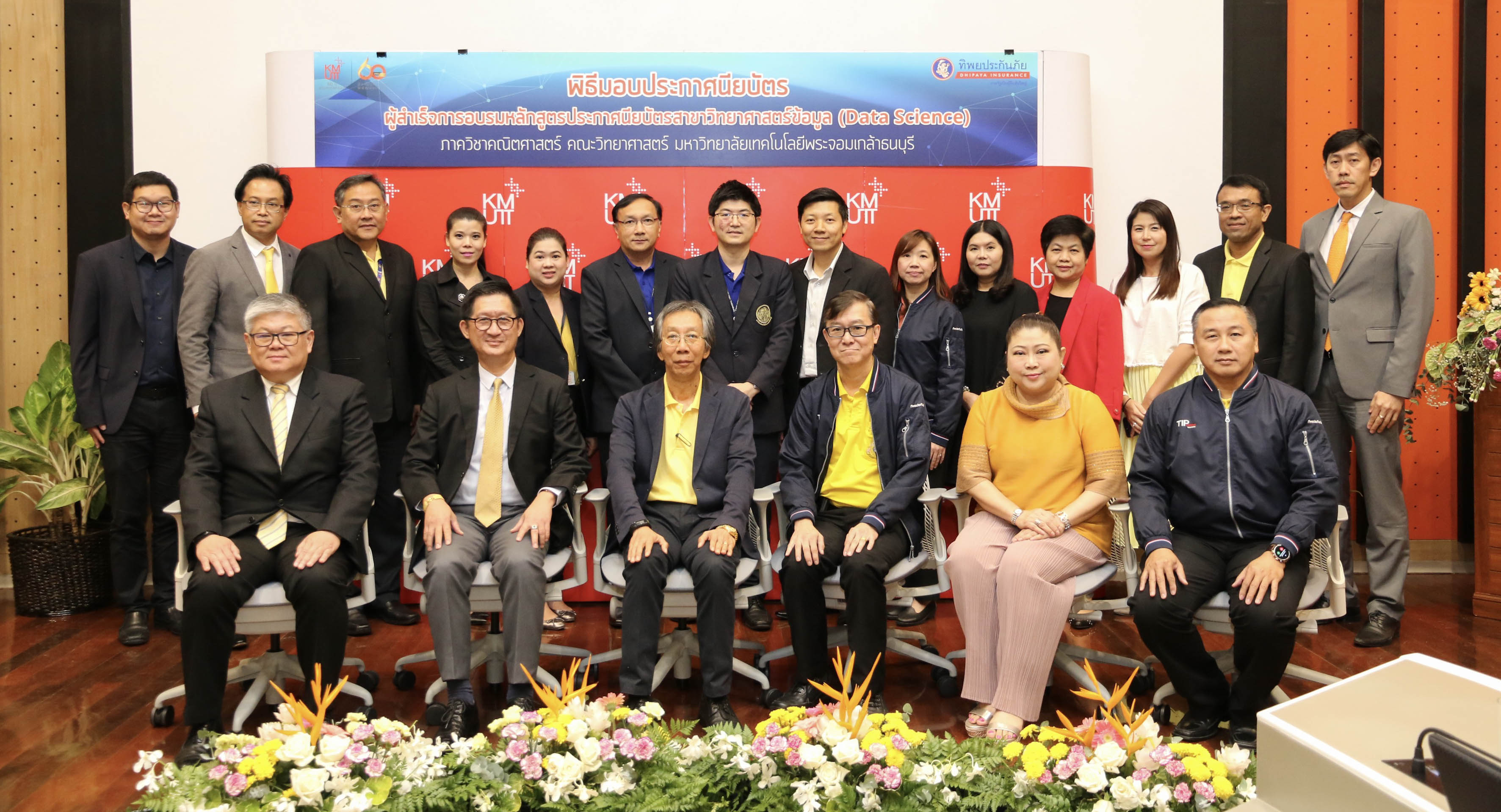 23 กรกฎาคม 2562 : ดร.สมพร สืบถวิลกุล กรรมการผู้จัดการใหญ่ ทิพยประกันภัย ผนึกพลังต่อยอดกับ มหาวิทยาลัยเทคโนโลยีพระจอมเกล้าธนบุรี จัดโครงการความร่วมมือทางวิชาการ ให้ความรู้อบรมหลักสูตรวิทยาศาสตร์ข้อมูล “Data Science” ภาควิชาคณิตศาสตร์ คณะวิทยาศาสตร์ ให้กับพนักงาน ตลอดหลักสูตรระยะเวลา 11 เดือน และนำเสนอโครงการต่างๆ เพื่อนำมาพัฒนาต่อยอดในการให้บริการ ให้เกิดประสิทธิภาพมากขึ้นและมีความล้ำสมัยมากที่สุด โดยได้รับเกียรติ รศ.ดร.สุวิทย์ แซ่เตีย อธิการบดีมหาวิทยาลัยเทคโนโลยีพระจอมเกล้าธนบุรี มอบประกาศนียบัตรแก่ผู้สำเร็จการอบรม