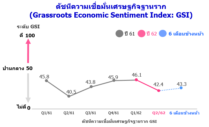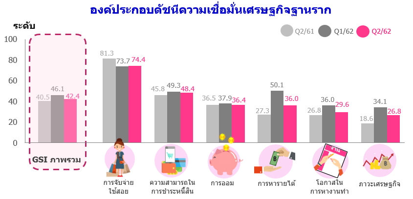 24 กรกฎาคม 2562 : ดร.ชาติชาย พยุหนาวีชัย ผู้อำนวยการธนาคารออมสิน เปิดเผยว่า “ผลการสำรวจดัชนีความเชื่อมั่นเศรษฐกิจฐานราก (GSI) ประจำไตรมาส 2 ปี 2562 ได้ดำเนินการสำรวจจากกลุ่มตัวอย่างประชาชนที่มีรายได้ไม่เกิน 15,000 บาท ทั่วประเทศ จำนวน 2,186 ตัวอย่าง พบว่า ดัชนี GSI ไตรมาส 2 ปี 2562 อยู่ที่ระดับ 42.4 ปรับลดลงจากไตรมาส 1 ปี 2562 ที่อยู่ระดับ 46.1 เนื่องจากประชาชนฐานรากมีความกังวลต่อภาวะเศรษฐกิจในปัจจุบัน จากรายได้ที่ลดลง ราคาสินค้าเกษตรยังทรงตัวอยู่ในระดับต่ำ