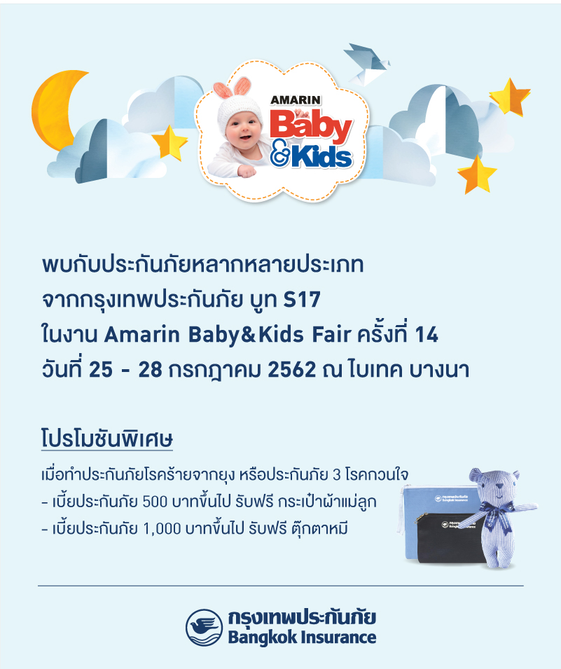 25 กรกฎาคม 2562 : บริษัท กรุงเทพประกันภัย จำกัด (มหาชน) หรือ BKI ร่วมออกบูทในงาน Amarin Baby&Kids Fair ครั้งที่ 14 ในวันที่ 25-28 กรกฎาคม 2562 ซึ่งบริษัทฯ ได้เปิดตัวกรมธรรม์ใหม่ ประกันภัย 3 โรคกวนใจ ที่ขายในงานนี้ก่อนใคร ให้ความคุ้มครองครอบคลุมทั้งกรณีป่วยด้วยโรคไข้หวัดใหญ่ โรคมือ เท้า ปาก และโรคร้ายจากยุง พร้อมมอบโปรโมชันพิเศษสุดๆ ในราคาเบาๆ ด้วยเบี้ยประกันภัยเริ่มต้นที่ 150 บาท/ปี เหมาะกับทุกช่วงวัย อุ่นใจทั้งครอบครัว ตั้งแต่เด็กอายุ 0-14 ปี และผู้ใหญ่อายุ 15-70 ปี