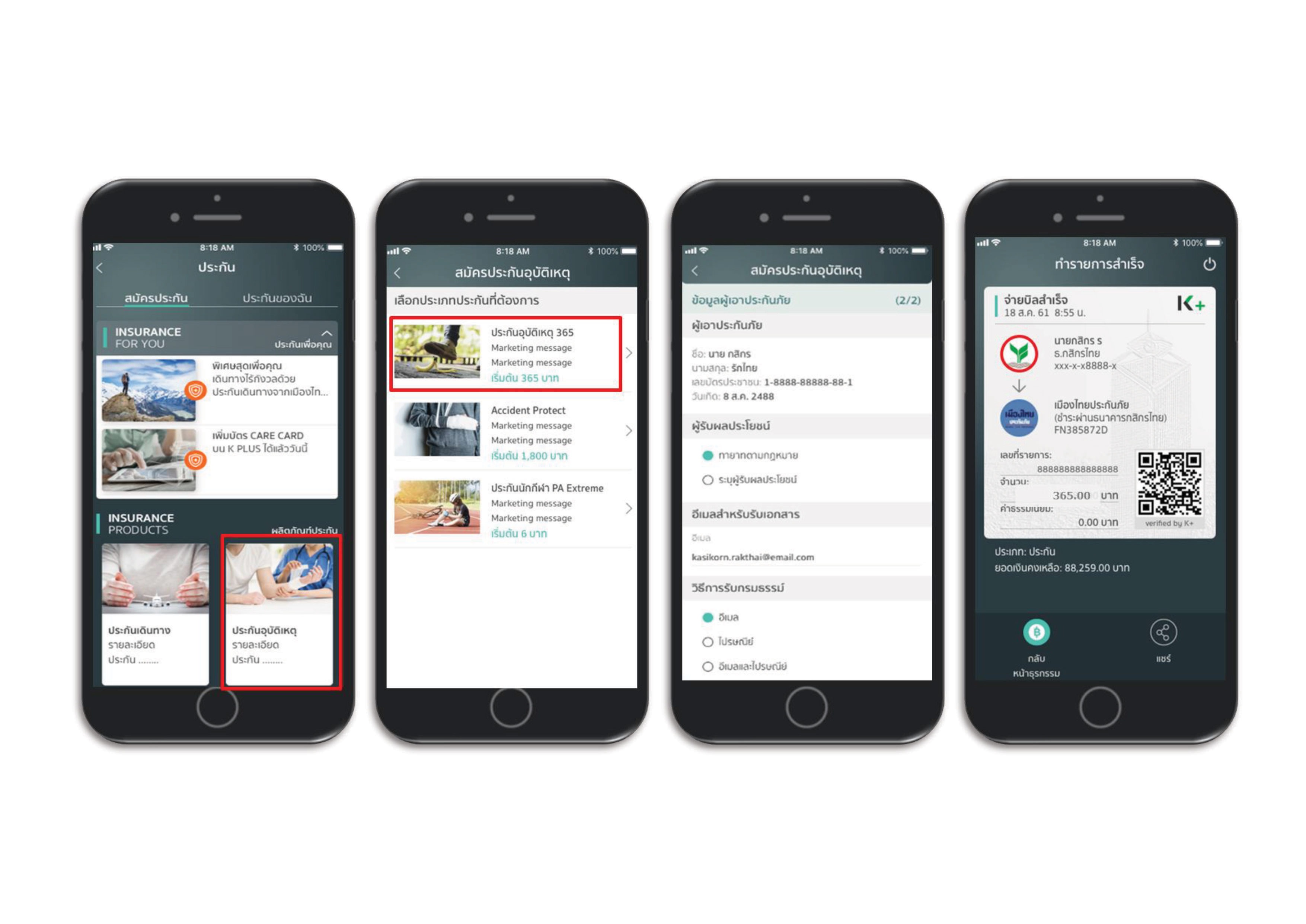 เมื่อเข้าหน้าหลักของ K PLUS เลือกปุ่ม “ธุรกรรม” กดรหัสเพื่อเข้าสู่ระบบ แล้วเลือก “บริการอื่นๆ” เลือกเมนู “ประกัน” จากนั้นเลือก “ประกันอุบัติเหตุ” และเลือกแผนของประกันที่ต้องการ และให้กรอกข้อมูลของผู้ที่ต้องการซื้อประกันและผู้รับประโยชน์ เมื่อกรอกข้อมูลครบถ้วนแล้วระบบจะแจ้งให้โอนเงินค่าเบี้ยประกัน เมื่อเสร็จสิ้นกระบวนการโอนเงินแล้ว ระบบจะส่งกรมธรรม์ให้ทาง e mail ที่ได้ให้ข้อมูลไว้ และจะได้รับความคุ้มครองในทันที ![]()
