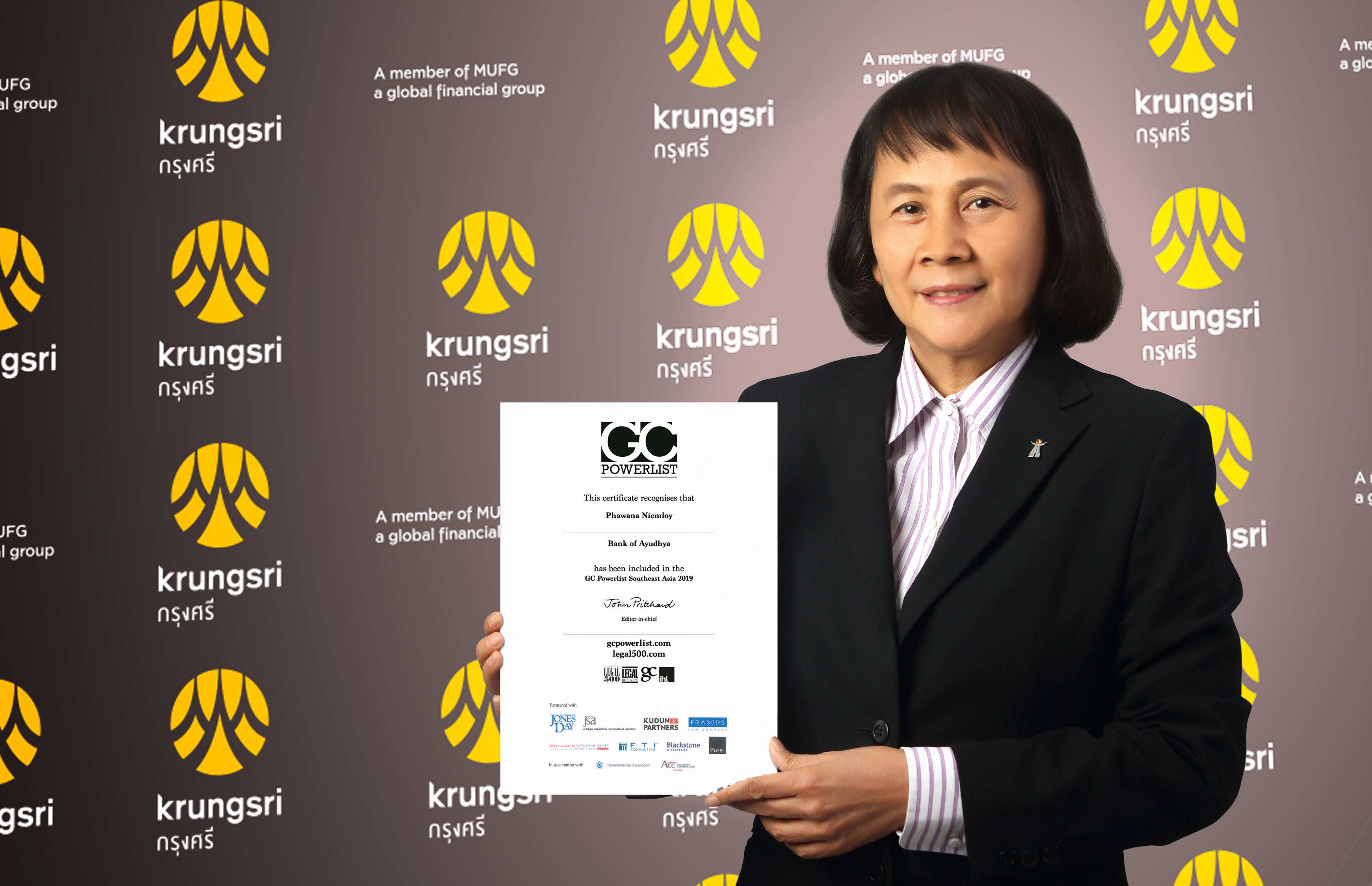 กรุงเทพฯ 30 กรกฎาคม 2562 : ภาวนา เนียมลอย ประธานคณะเจ้าหน้าที่ด้านกฎหมาย ธนาคารกรุงศรีอยุธยา จำกัด (มหาชน) ได้รับยกย่องเป็นผู้นำฝ่ายกฎหมายดีเด่น หนึ่งใน GC Powerlist Southeast Asia 2019 จัดโดย The Legal 500 และ GC Powerlist สื่อชั้นนำในวงการกฎหมายระดับโลก ซึ่งพิจารณาและประมวลความคิดเห็นจากบริษัทกฎหมายและกลุ่มงานด้านกฎหมายภายใต้องค์กรธุรกิจชั้นนำในภาคพื้นเอเชียตะวันออกเฉียงใต้ เพื่อยกย่องบุคลากรในด้านกฎหมายอันเป็นต้นแบบในการขับเคลื่อนองค์กร การพัฒนาแนวทางแก้ไขปัญหาและความท้าทายที่ซับซ้อน สนับสนุนโครงสร้างและรูปแบบธุรกิจที่ดีเพื่อเป็นตัวอย่างในวงการกฎหมาย ![]()