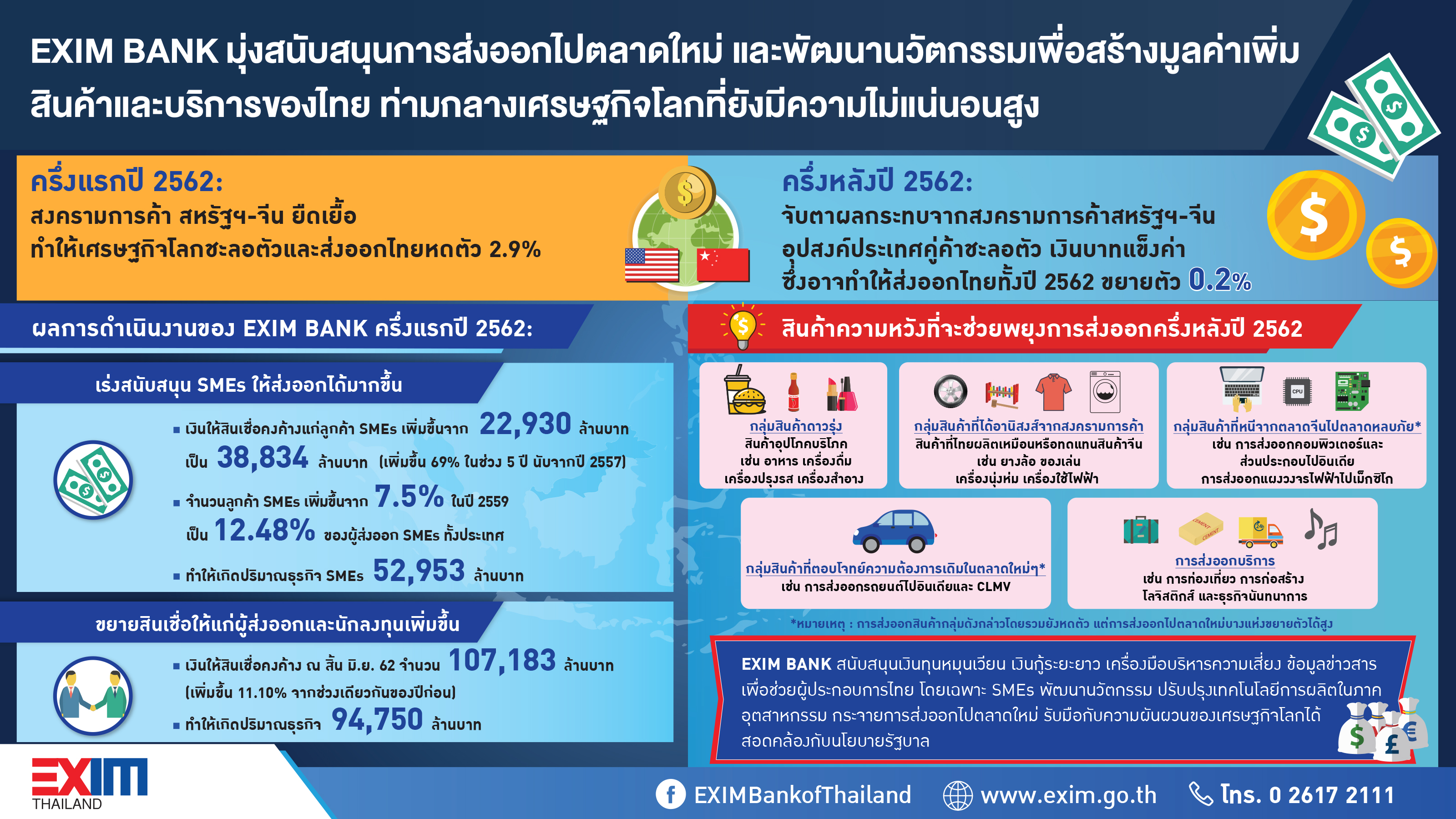 31 กรกฎาคม 2562 : นายพิศิษฐ์ เสรีวิวัฒนา กรรมการผู้จัดการ ธนาคารเพื่อการส่งออกและนำเข้าแห่งประเทศไทย (EXIM BANK) เปิดเผยว่า ในช่วงครึ่งแรกปี 2562 มูลค่าส่งออกของไทยหดตัวถึง 2.9% เป็นผลของสงครามการค้าที่ยังยืดเยื้อระหว่างสหรัฐฯ-จีน ทำให้สินค้าส่งออกของไทยในห่วงโซ่การผลิตและพึ่งพาตลาดจีนสูงหดตัวต่อเนื่อง อาทิ คอมพิวเตอร์และส่วนประกอบ แผงวงจรไฟฟ้า เม็ดพลาสติก จากสถานการณ์ดังกล่าว หลายหน่วยงานรวมทั้ง EXIM BANK ได้ปรับลดคาดการณ์การขยายตัวของมูลค่าส่งออกของไทยในปี 2562 โดยคาดว่าจะขยายตัว 0.2%