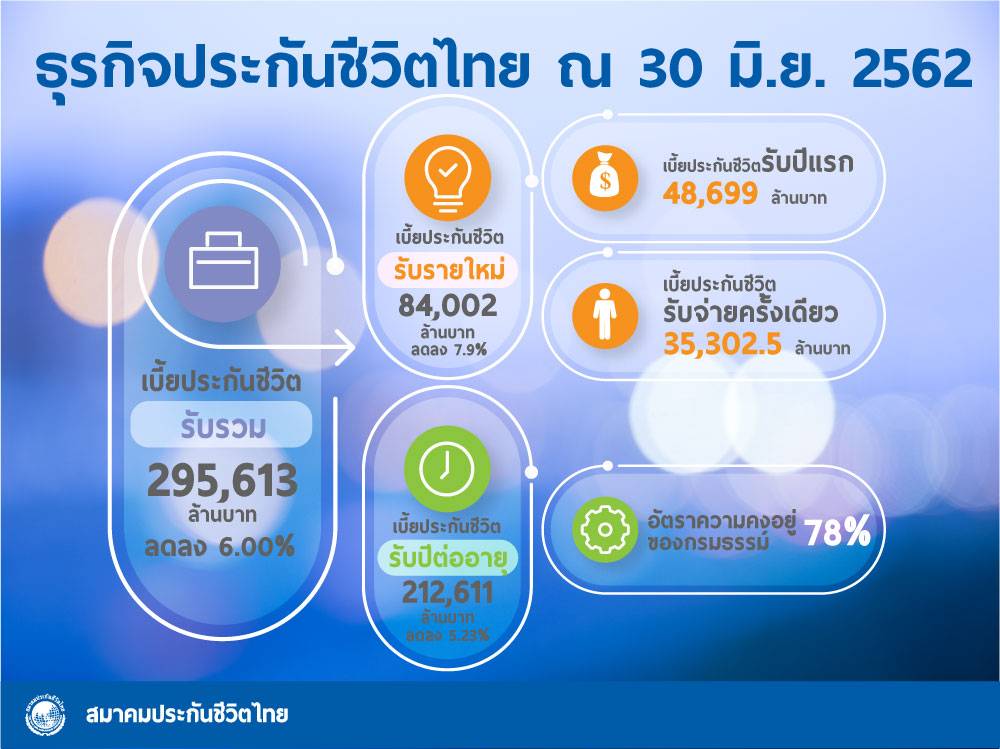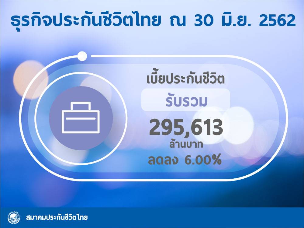 31 กรกฎาคม 2562 : นางนุสรา (อัสสกุล) บัญญัติปิยพจน์ นายกสมาคมประกันชีวิตไทย เปิดเผยว่า ผลการดำเดือนงานช่วง 6 เดือนแรกปี 2562 (มกราคม – มิถุนายน) ธุรกิจประกันชีวิตผลิตเบี้ยประกันภัยรับรวมทั้งสิ้น 295,612.96 ล้านบาท คิดเป็นอัตราการเติบโตลดลงร้อยละ 6 เมื่อเทียบกับระยะเวลาเดียวกันในปีที่ผ่านมา จำแนกเป็นเบี้ยประกันภัยรับรายใหม่ จำนวน 84,001.56 ล้านบาท อัตราเติบโตลดลงร้อยละ 8 และเบี้ยประกันภัยรับปีต่อไปจำนวน 211,611.40 ล้านบาท อัตราเติบโตลดลงร้อยละ 5 ซึ่งมีอัตราความคงอยู่ของกรมธรรม์ประกันชีวิตร้อยละ 78 สำหรับเบี้ยประกันภัยรับรายใหม่ ประกอบด้วย