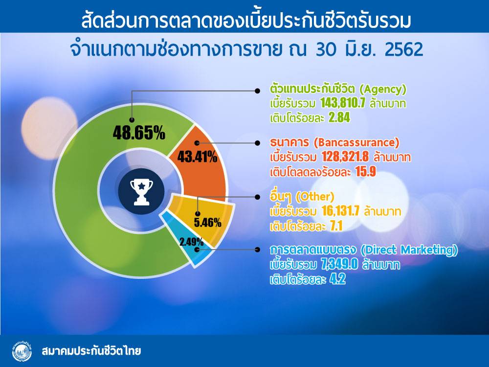 อันดับ 1 การขายผ่านตัวแทนประกันชีวิต จำนวน 143,810.66 ล้านบาท สัดส่วนร้อยละ 48.65 เติบโตเพิ่มขึ้นร้อยละ 2.84 เมื่อเทียบกับระยะเวลาเดียวกันในปีที่ผ่านมา อันดับ 2 การขายผ่านธนาคาร จำนวน 128,321.78 ล้านบาท สัดส่วนร้อยละ 43.41 เติบโตลดลงร้อยละ 15.88 เมื่อเทียบกับระยะเวลาเดียวกันในปีที่ผ่านมา