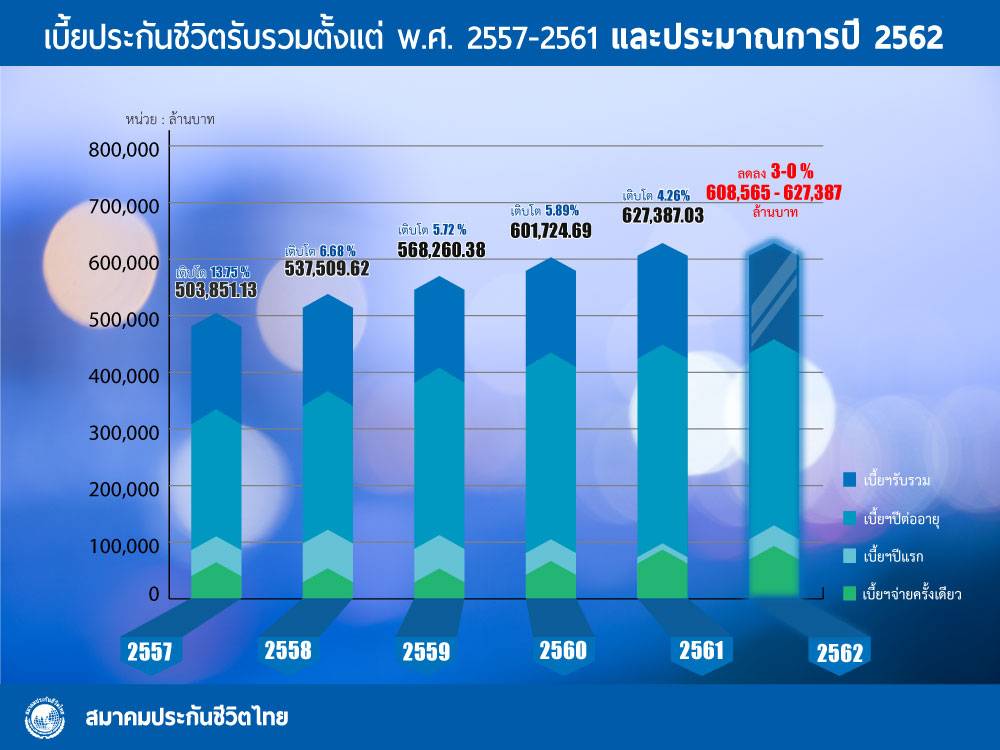 อย่างไรก็ตาม แม้ว่าภาคธุรกิจจะเผชิญกับความท้าทายจากหลากหลายปัจจัย หากแต่คาดการณ์ว่าธุรกิจประกันชีวิตยังคงมีเบี้ยประกันภัยรับรวมเติบโตเทียบเท่ากับปี 2561 ที่ผ่านมา เนื่องจากเศรษฐกิจไทย ในภาพรวมมีแนวโน้มขยายตัวต่ำกว่าที่ประเมินไว้ โดยสภาพัฒนาการเศรษฐกิจและสังคมแห่งชาติ (สศช.) ปรับลดประมาณการจีดีพีในปี 2562 ลงที่ 3.3- 3.8% จากเดิมเคยคาดการณ์ไว้ว่าเติบโต 3.5 – 4.5%