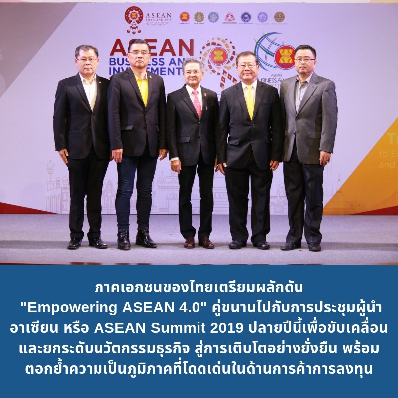 31 กรกฎาคม 2562 : สภาที่ปรึกษาธุรกิจอาเซียน (ASEAN-BAC) กระทรวงการต่างประเทศ กระทรวงพาณิชย์ และคณะกรรมการร่วมภาคเอกชน 3 สถาบัน (กกร.) ร่วมกันจัดงาน ASEAN Business and Investment Summit 2019 (ABIS 2019) เพื่อเป็นเวทีให้ผู้นำประเทศต่างๆ ได้แสดงวิสัยทัศน์และมุมมองในหลากหลายประเด็นที่เป็นโอกาสและความท้าทายภายใต้กระแสการเปลี่ยนแปลงของเศรษฐกิจโลกที่ทวีความรุนแรงอยู่ในขณะนี้ อาทิ ประเด็นทางด้านการค้า การลงทุน และการอำนวยความสะดวกด้านการประกอบธุรกิจ รวมทั้งการรวมตัวทางเศรษฐกิจและความร่วมมือทางเศรษฐกิจในภูมิภาคอาเซียน โดยจะจัดขึ้นระหว่างวันที่ 2-3 พฤศจิกายน 2562 ณ ศูนย์แสดงสินค้าและการประชุม อิมแพ็ค เมืองทองธานี คาดว่าจะมีผู้เข้าร่วมงานจำนวนกว่า 800 คน