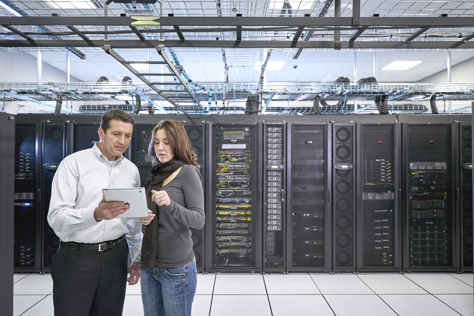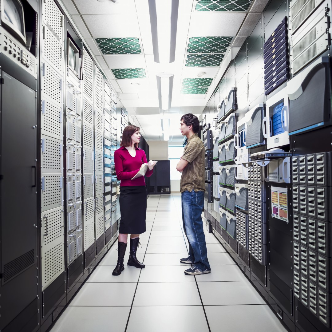 Man and woman standing in computer server room