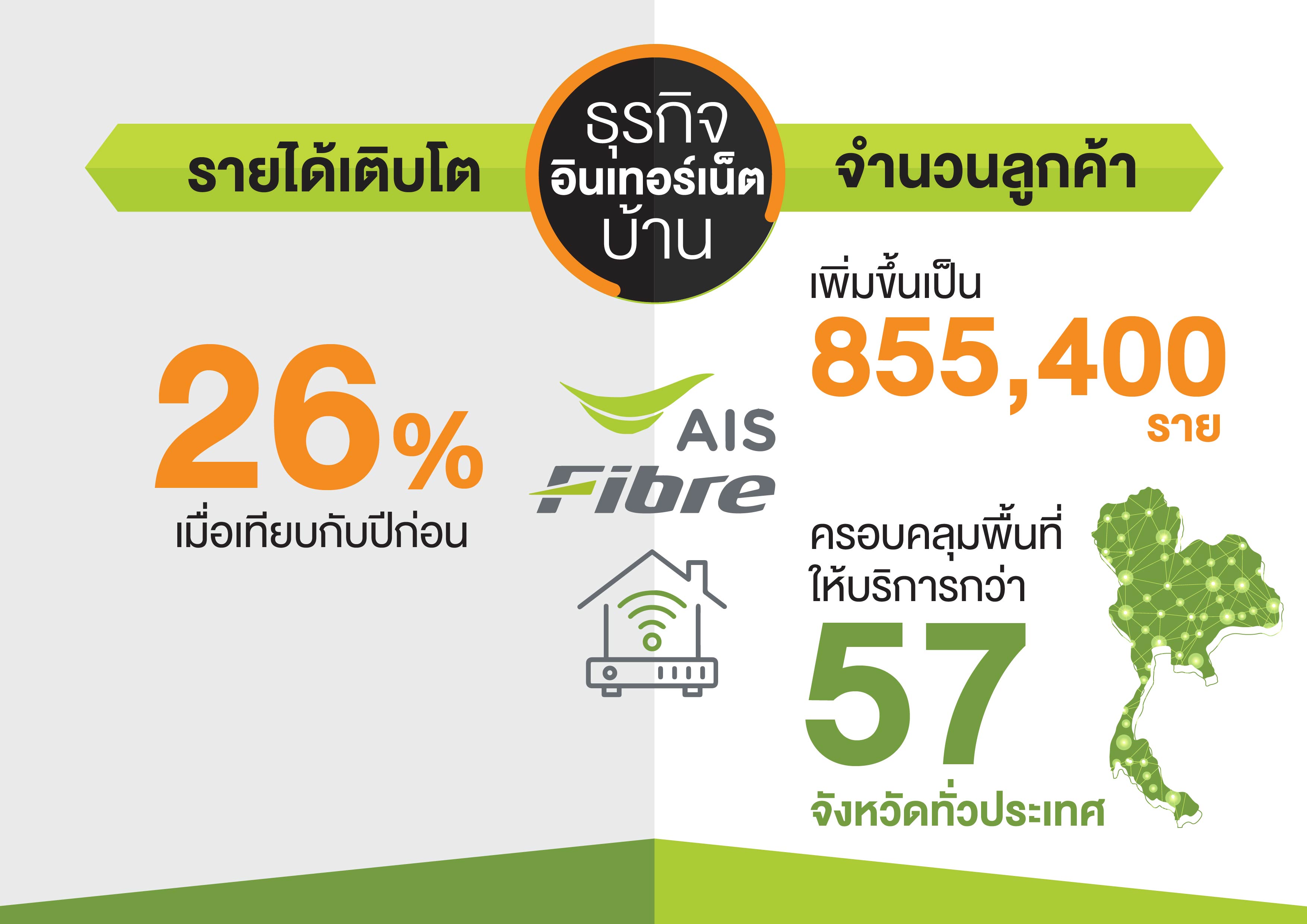 ปัจจุบันเอไอเอสยังคงความเป็นผู้นำอย่างแข็งแกร่งโดยมีจำนวนลูกค้าโทรศัพท์มือถือสูงสุดในตลาดที่ 41.5 ล้านเลขหมาย ขณะที่มีสัดส่วนลูกค้าที่ใช้ 4G สูงถึง 66% และมีการใช้งานดาต้าเพิ่มขึ้นเป็น 11.5 กิกะไบต์ต่อเดือน จาก 8.9 กิกะไบต์ต่อเดือน ในช่วงเดียวกันของปีที่แล้ว ส่วนธุรกิจอินเทอร์เน็ตบ้าน AIS Fibre ยังคงมีรายได้เติบโตต่อเนื่องอย่างแข็งแกร่งด้วยอัตราการเติบโตกว่า 26% ด้วยคุณภาพโครงข่ายและงานบริการที่ดีเยี่ยม พร้อมด้วยกลยุทธ์ Fixed Mobile Convergence ที่ดึงดูดใจลูกค้า จนทำให้ในปัจจุบัน AIS Fibre มีฐานลูกค้าเพิ่มขึ้นเป็น 855,400 ราย ครอบคลุมการใช้งานในพื้นที่ 57 จังหวัดทั่วประเทศ และยังคงเน้นย้ำเป้าหมายจำนวนลูกค้า 1 ล้านรายภายในสิ้นปีนี้