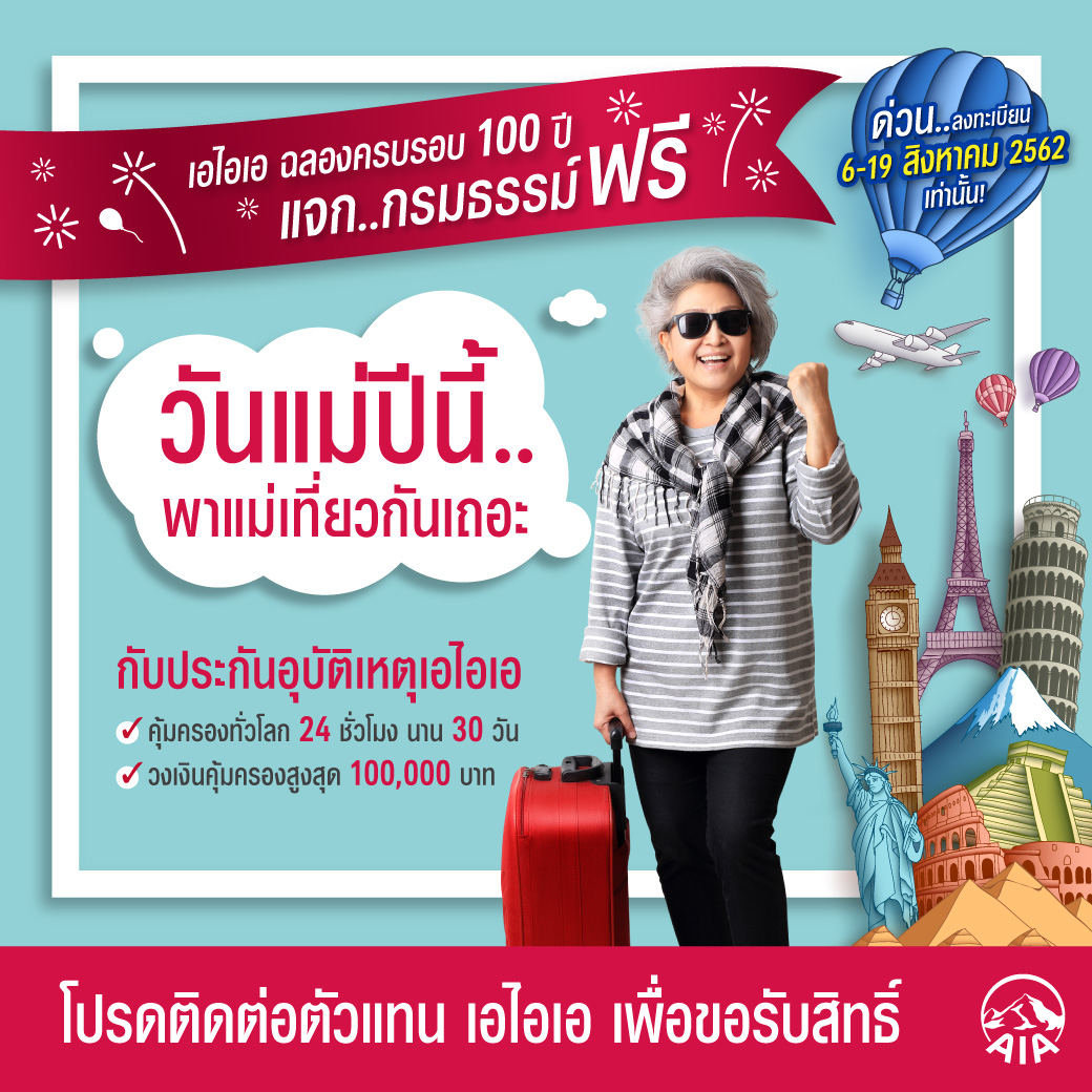 ทั้งนี้ เอไอเอ มีความมุ่งมั่นที่จะส่งเสริมให้คนไทยมีความคุ้มครองที่เพียงพอและครอบคลุม โดยเฉพาะความคุ้มครองด้านอุบัติเหตุในช่วงเทศกาล ตามคำมั่นสัญญา ‘Healthier, Longer, Better Lives – เพื่อสุขภาพและชีวิตที่ดีขึ้น’ ในช่วงเทศกาลวันแม่นี้ เพื่อเป็นการแสดงความรักต่อผู้มีพระคุณ และให้คนไทยสามารถเดินทางได้อย่างอุ่นใจ เอไอเอ ประเทศไทย ขอมอบกรมธรรม์อุบัติเหตุฟรี ไม่จำกัดจำนวน ให้แก่ประชาชนทั่วไป ด้วยวงเงินคุ้มครองสูงสุดถึง 100,000 บาทต่อกรมธรรม์ กรณีเสียชีวิตจากอุบัติเหตุ และให้การคุ้มครองทั่วโลกตลอด 24 ชั่วโมง อายุความคุ้มครองนานถึง 30 วัน โดยเริ่มคุ้มครองนับตั้งแต่วันถัดไปของวันที่ลงทะเบียน ทั้งนี้ผู้เอาประกันภัยจะต้องถือสัญชาติไทย และมีอายุตั้งแต่ 20-70 ปีบริบูรณ์ ณ วันที่ทำประกันภัยเท่านั้น