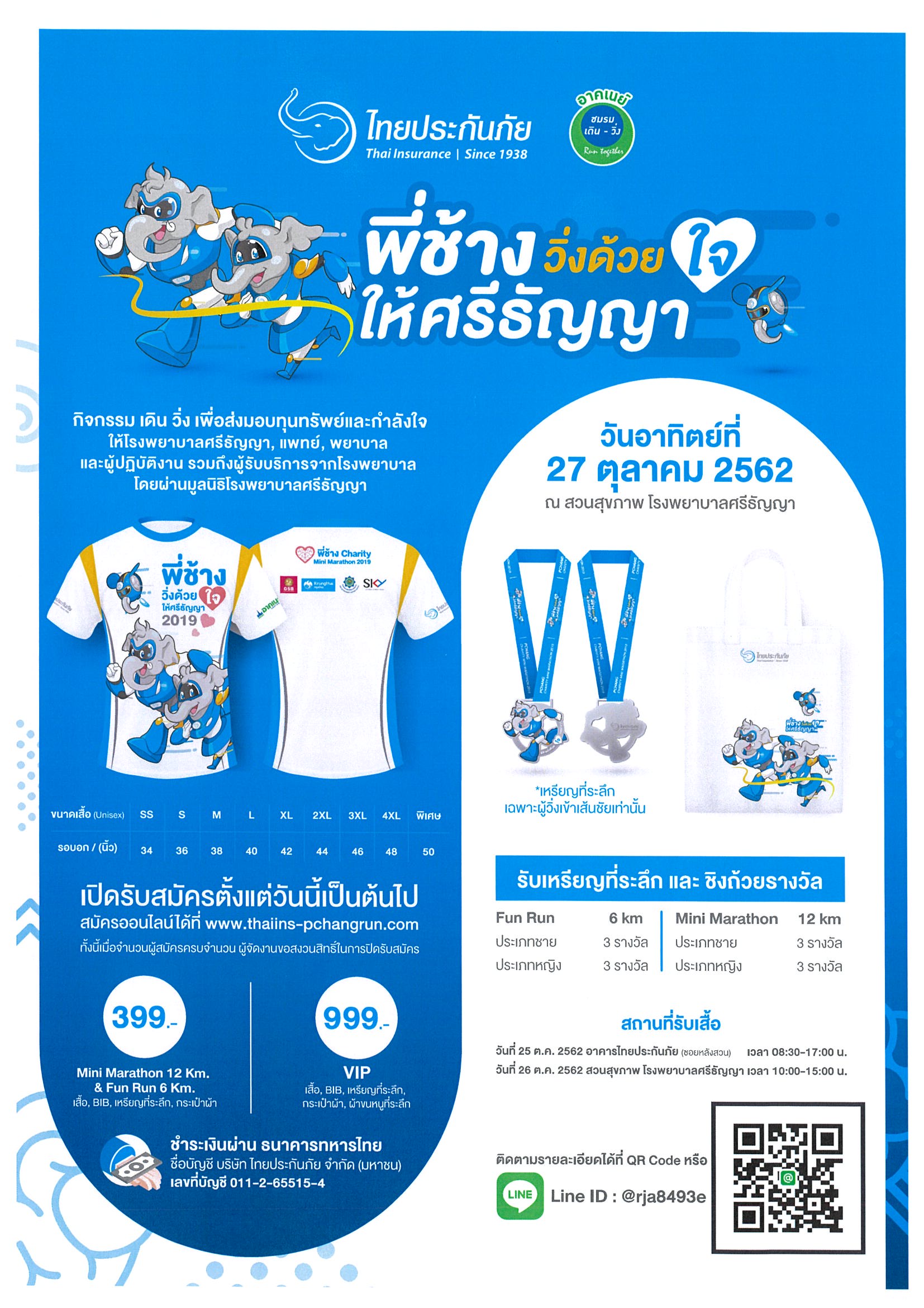 สำหรับผู้ที่สนใจสมัครเข้าร่วมกิจกรรม เดิน-วิ่ง “พี่ช้างวิ่งด้วยใจ…ให้ศรีธัญญา” สามารถดูรายละเอียดเพิ่มเติม และ สมัครออนไลน์ได้แล้ววันนี้ ที่ www.thaiins-pchangrun.com โดยเสียค่าใช้จ่ายในการสมัครท่านละ 399 บาท ซึ่งรายได้หลักหักค่าใช้จ่ายจะนำไปมอบให้มูลนิธิโรงพยาบาลศรีธัญญาต่อไป และเพื่อเป็นการขอบคุณผู้เข้าร่วมกิจกรรมทุกท่านที่ร่วมทำบุญกับทางไทยประกันภัยในครั้งนี้ บริษัทฯ ได้จัดทำประกันอุบัติเหตุฟรี!! ให้กับทุกท่านอีกด้วย ![]()