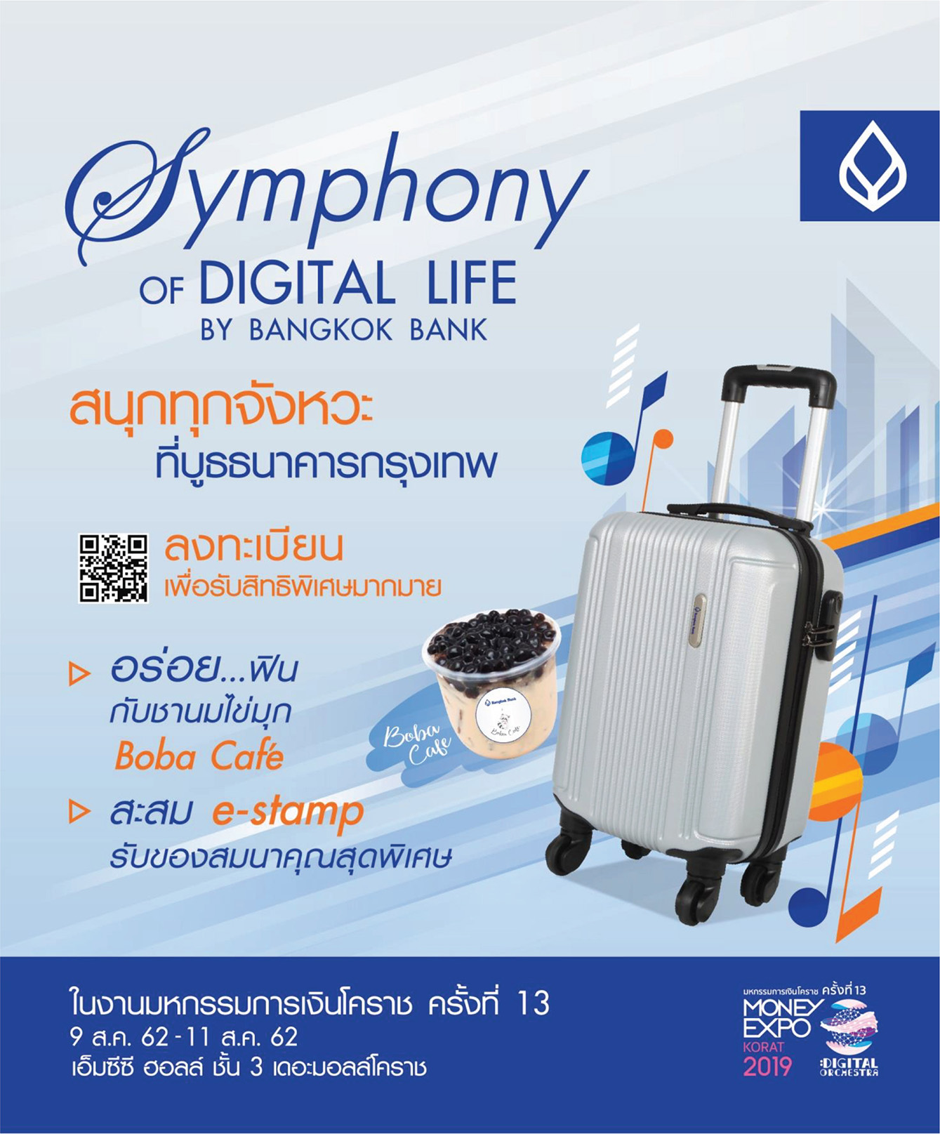 ดร.ทวีลาภ ฤทธาภิรมย์ กรรมการผู้ช่วยผู้จัดการใหญ่ ธนาคารกรุงเทพ จำกัด (มหาชน) เปิดเผยว่า ธนาคารได้เข้าร่วมงาน “มหกรรมการเงินโคราช ครั้งที่ 13” (Money Expo Korat 2019) โดยนำเสนอผลิตภัณฑ์และบริการทางการเงินพร้อมสิทธิพิเศษมากมาย ภายใต้คอนเซปต์ ‘Symphony of Digital Life by Bangkok Bank’ ที่ต้องการสะท้อนถึงความตั้งใจนำเสนอประสบการณ์ด้านการเงินรูปแบบใหม่ที่เกิดขึ้นจากการผสมผสานของผลิตภัณฑ์และบริการทางการเงินต่างๆ ของธนาคารกรุงเทพและพันธมิตรชั้นนำ เข้ามาเป็น Digital Solution ที่ลงตัว ตอบโจทย์ความต้องการของลูกค้า และสอดคล้องกับไลฟ์สไตล์ยุคดิจิทัล เสมือนการบรรเลงบทเพลงของวงออร์เคสตราที่ผสานเครื่องดนตรีหลากหลายชนิด เป็นบทเพลง Symphony ได้อย่างไพเราะถูกใจและจับใจผู้ฟัง