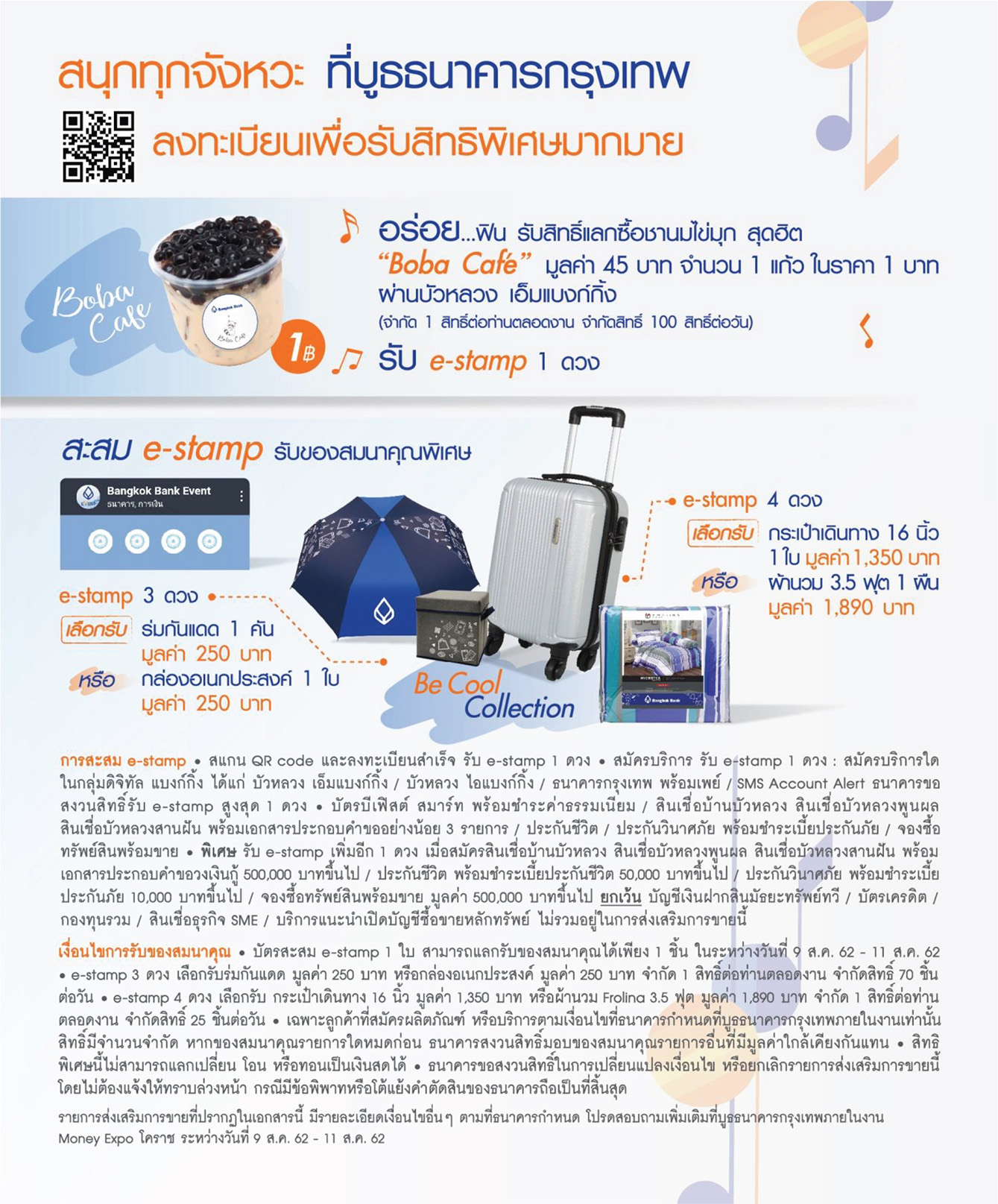 พร้อมดีลพิเศษที่หาไม่ได้จากที่ไหน เพียงลงทะเบียนร่วมกิจกรรม และสะสม e-Stamp จากการสมัครใช้งานบริการทางการเงินต่างๆ กับธนาคารกรุงเทพ ตามที่กำหนด เพื่อแลกรับของสมนาคุณสุดพิเศษ พร้อมรับสิทธิพิเศษต่างๆ อีกมากมาย เช่น รับสิทธิ์แลกซื้อชานมไข่มุกสุดฮิตจาก ‘Boba Cafe’ มูลค่า 45 บาท จำนวน 1 แก้ว ในราคาเพียง 1 บาทผ่านบัวหลวง เอ็มแบงก์กิ้ง สะสม e-Stamp ครบ 3 ดวง เลือกรับ ร่มกันแดด 1 คัน หรือ กล่องเอนกประสงค์ 1 ใบ สะสม e-Stamp ครบ 4 ดวง เลือกรับ กระเป๋าเดินทาง 16” 1 ใบ หรือ ผ้านวม 3.5 ฟุต 1 ผืน