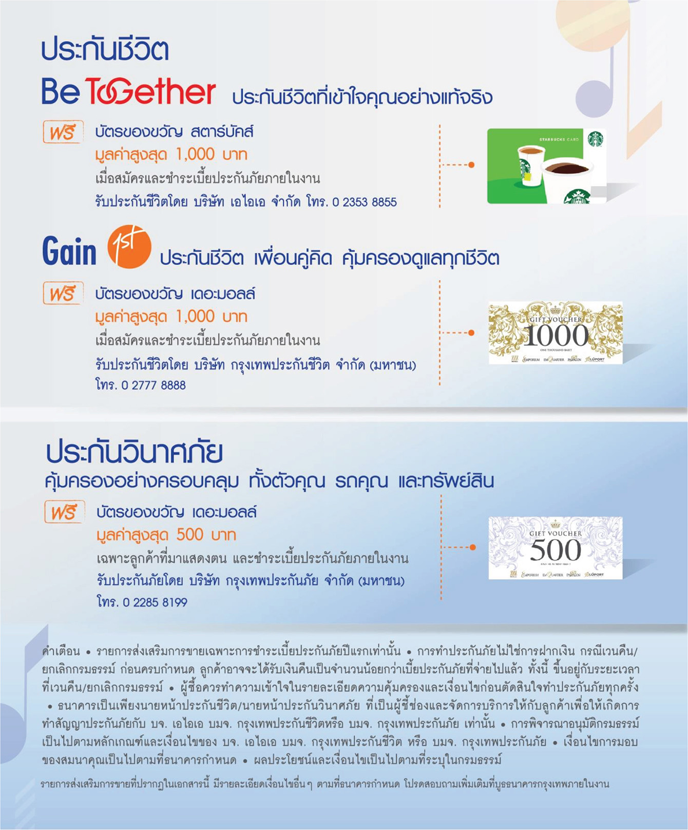 นอกจากนี้ ธนาคารยังได้เตรียมผลิตภัณฑ์และบริการทางการเงินต่างๆ ไว้พร้อมนำเสนอลูกค้าทุกกลุ่ม ได้แก่ บัวหลวง เอ็มแบงก์กิ้ง บริการสมัครบัตรเครดิตแอร์เอเชีย ธนาคารกรุงเทพ บริการสมัครบัตรเดบิตบีเฟิสต์ทั้ง 2 รูปแบบ บัตรบีเฟิสต์ สมาร์ท ทีพีเอ็น แรบบิท ศิริราช และบัตรบีเฟิสต์ สมาร์ท ทีพีเอ็น มาสเตอร์การ์ด บริการแนะนำเปิดบัญชีซื้อขายหลักทรัพย์ บัวหลวงทรัพย์สินพร้อมขาย กองทุนบัวหลวง ประกันชีวิต ประกันวินาศภัย และสินเชื่อบ้านบัวหลวง โดยลูกค้าสามารถลงทะเบียนจองสิทธิ์รับอัตราดอกเบี้ยพิเศษได้ภายในงาน ซึ่งธนาคารได้จัดเตรียมโปรโมชั่นพิเศษ และของสมนาคุณ เพื่อมอบสำหรับลูกค้าที่สมัครใช้บริการต่างๆ