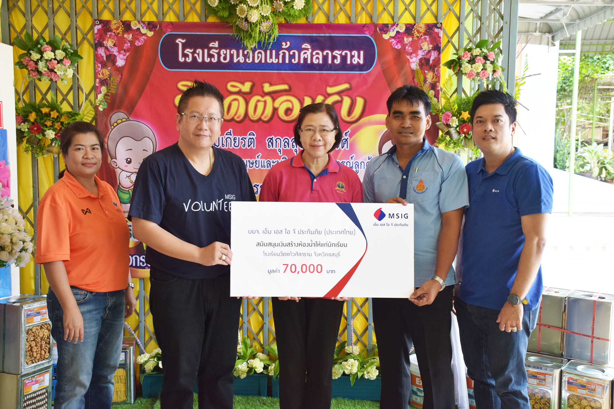 13 สิงหาคม 2562 : บริษัท เอ็ม เอส ไอ จี ประกันภัย (ประเทศไทย) จำกัด (มหาชน) โดย ดร. สมเกียรติ สกุลสุรเอกพงศ์ ผู้อำนวยการอาวุโส ทรัพยากรมนุษย์และบริหารประสบการณ์ลูกค้า มอบเงินสนับสนุนสร้างห้องน้ำให้แก่นักเรียน โรงเรียนวัดแก้วศิลาราม จังหวัดชลบุรี จำนวน 70,000 บาท พร้อมนำพนักงานจิตอาสาร่วมทำกิจกรรมทาสีรอบรั้วโรงเรียน เพื่อปรับภูมิทัศน์ให้สวยงาม ![]()