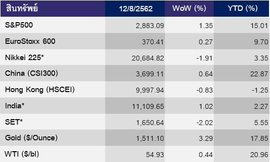 ในสัปดาห์นี้ ตลาดหุ้นโลก มีแนวโน้มเคลื่อนไหวผันผวน ได้รับปัจจัยกดดันจาก ความกังวลสงครามการค้าระหว่างสหรัฐฯ-จีน ที่กลับมาทวีความรุนแรงขึ้น หลังจีนมีแนวโน้มออกมาตรการตอบโต้สหรัฐฯเพิ่มเติม จากก่อนหน้านี้ที่ทางการจีนกำหนดค่ากลางของเงินหยวนให้อ่อนค่ากว่า 7 หยวนต่อดอลลาร์ สหรัฐฯอย่างต่อเนื่อง และมีคำสั่งยกเลิกการซื้อสินค้าเกษตรจากสหรัฐฯ โดยเฉพาะในกรณีที่สหรัฐฯ ตัดสินใจไม่ขยายระยะเวลาผ่อนผันเกี่ยวกับการอนุญาตให้มีการอัพเดทซอฟท์แวร์ใน บริษัทหัวเว่ย ออกไปจากเดิมในวันที่ 19 ส.ค.นี้