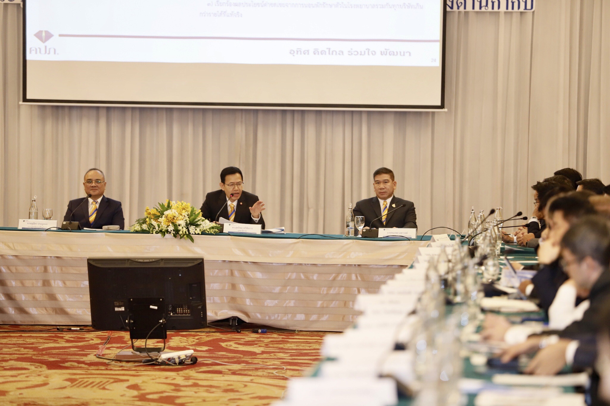 “ขั้นตอนหลังจากการประชุมในวันนี้ จะได้รวบรวมทุกความเห็นและข้อเสนอแนะให้คณะทำงานฯนำไปวิเคราะห์ในการปรับปรุงกระบวนการให้ความเห็นชอบผลิตภัณฑ์ประกันภัย และปรับปรุงแบบสัญญาประกันสุขภาพมาตรฐาน ให้เหมาะสมยิ่งขึ้น ซึ่งจะช่วยให้ทุกฝ่ายได้รับประโยชน์และดำเนินการไปในแนวทางเดียวกันเพื่อส่งเสริมอุตสาหกรรมประกันภัยไทยให้มีความเข้มแข็ง ก้าวทันตลาด ทำให้บริษัทสามารถผลิตสินค้าได้ตรงตามความต้องการและถึงมือผู้บริโภคได้รวดเร็วขึ้น อีกทั้ง สะท้อนความเสี่ยง ต้นทุนที่แท้จริง และความพร้อมของบริษัท โดยเป็นการสรรค์สร้างสิ่งที่มีอยู่แล้วให้มีความสมบูรณ์และมีประสิทธิภาพมากยิ่งขึ้น รวมทั้งจะเป็นการเพิ่มประสิทธิภาพในการคุ้มครองผู้บริโภคซึ่งการดำเนินการดังกล่าวจะเป็นการพลิกโฉมธุรกิจประกันภัยโดยมีสำนักงาน คปภ. เดินเคียงข้างไปกับธุรกิจประกันภัยเพื่อส่งเสริมความพร้อมของภาคธุรกิจควบคู่กับการดูแลสิทธิประโยชน์ที่ประชาชนจะได้รับจากการใช้บริการด้านผลิตภัณฑ์ประกันภัย” เลขาธิการ คปภ. กล่าวในตอนท้าย ![]()