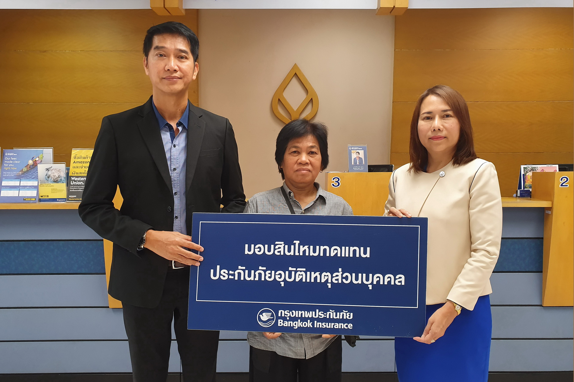 15 สิงหาคม 2562 : บริษัท กรุงเทพประกันภัย จำกัด (มหาชน) หรือ BKI โดย ประยูร แน่งน้อย (ซ้ายสุด) ผู้จัดการสาขาสระบุรี ธุรกิจสาขาและการร่วมทุน เป็นผู้แทนบริษัทฯ มอบสินไหมทดแทนประกันภัยอุบัติเหตุส่วนบุคคล จำนวนเงิน 420,000 บาท ให้แก่ สังเวียน โชติสังข์ (กลาง) ผู้รับประโยชน์ซึ่งเป็นภรรยาของ ประวิทย์ โชติสังข์ ผู้เอาประกันภัยที่เสียชีวิตจากอุบัติเหตุขับขี่รถจักรยานยนต์ โดยมี วาสนา คงคะสุวรรณ (ขวาสุด) ผู้จัดการธนาคารกรุงเทพ สาขาพระพุทธบาท ร่วมมอบสินไหมทดแทนและเป็นสักขีพยาน ณ ธนาคารกรุงเทพ สาขาพระพุทธบาท เมื่อเร็วๆ นี้ ![]()