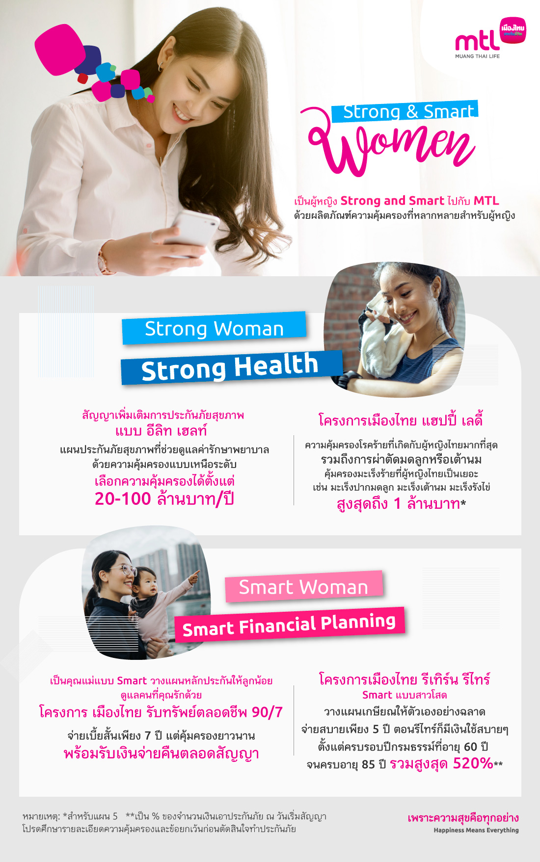 ส่วนผลิตภัณฑ์สำหรับผู้หญิงที่สนใจเรื่องการวางแผนทางการเงิน Smart Woman Smart Financial Planning หากคุณเป็นคุณแม่แบบ Smart ที่ต้องการวางแผนหลักประกันให้ลูกน้อยพร้อมดูแลคนที่คุณรัก ขอนำเสนอ “โครงการเมืองไทย รับทรัพย์ตลอดชีพ 90/7” ที่จ่ายเบี้ยประกันภัยระยะสั้นเพียง 7 ปี แต่ให้ความคุ้มครองยาวนานถึงครบอายุ 90 ปี พร้อมรับเงินจ่ายคืนตลอดสัญญา