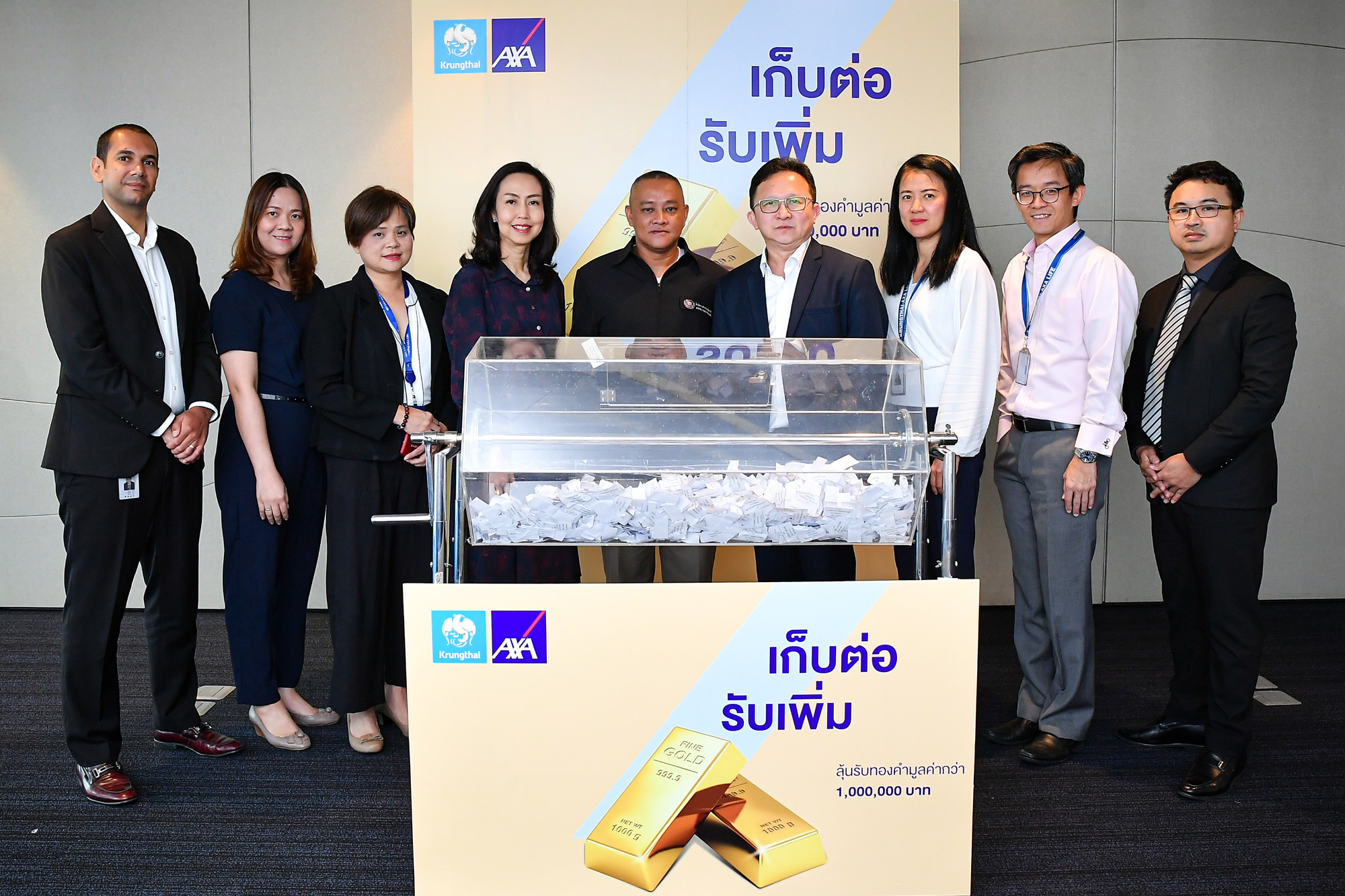 29 สิงหาคม 2562 : บมจ.กรุงไทย-แอกซ่า ประกันชีวิต นำโดย ภควิภา เจริญตรา (ที่ 4 จากซ้าย) ประธานเจ้าหน้าที่ ฝ่ายลูกค้า ปิติ ธนวัฒน์ (ที่ 4 จากขวา) ผู้ช่วยกรรมการผู้จัดการใหญ่ ผู้บริหารกลุ่ม กลุ่มเครือข่ายนครหลวง 1 ธนาคารกรุงไทย พร้อมผู้บริหารกรุงไทย-แอกซ่า ประกันชีวิต ร่วมจับรายชื่อผู้โชคดีที่ได้รับทองคำจากแคมเปญ “เก็บต่อ รับเพิ่ม” ครั้งที่ 1 ณ สำนักงานใหญ่ กรุงไทย-แอกซ่า ประกันชีวิต ถนนพระราม 9