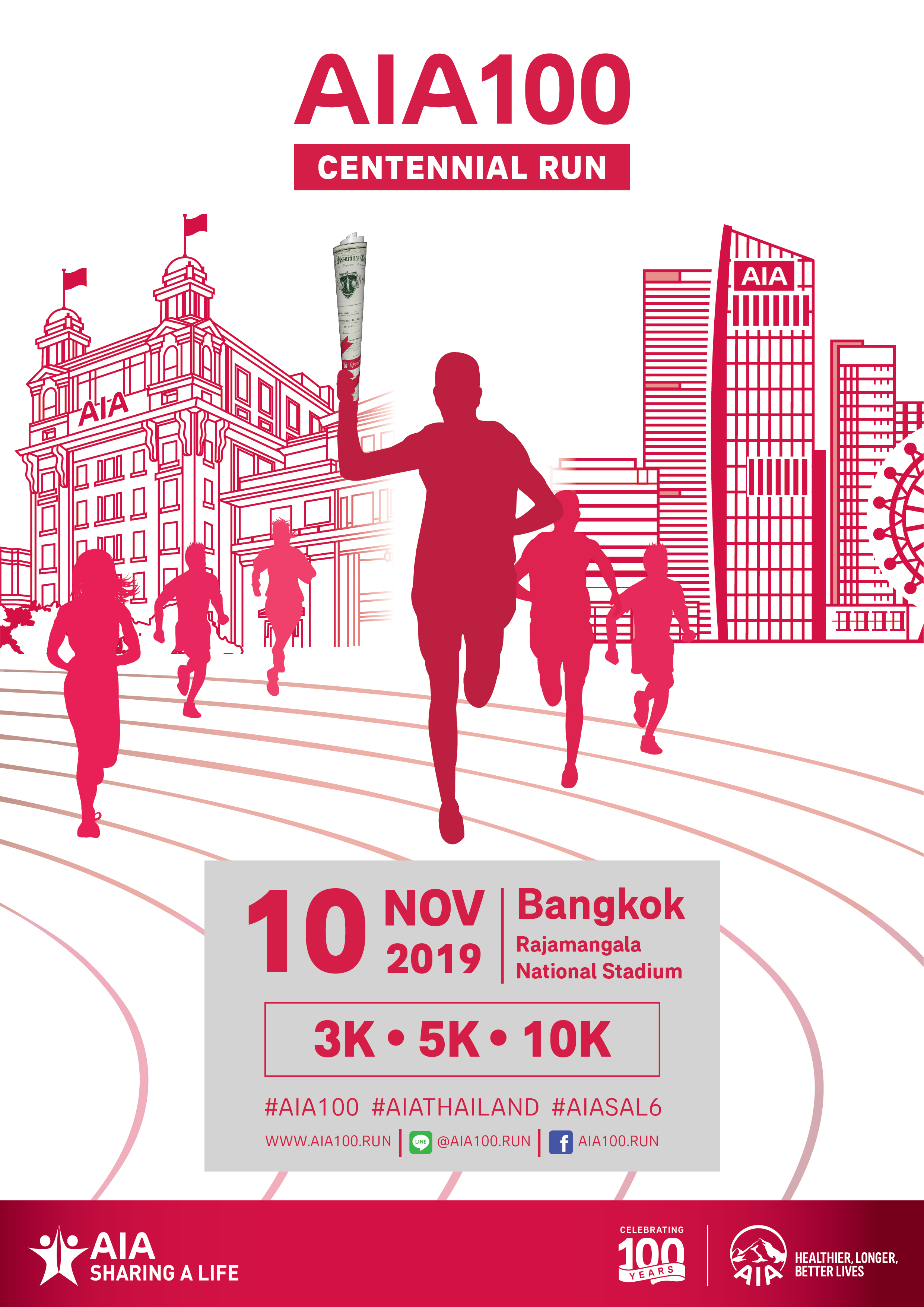 เอไอเอ ประเทศไทย จะจัดงานเดิน-วิ่ง “AIA Centennial Run” ครั้งยิ่งใหญ่ขึ้นในวันที่ 10 พฤศจิกายนนี้ ซึ่งเป็นการผสมผสานระหว่างการเฉลิมฉลองครบรอบ 100 ปี และกิจกรรม AIA Sharing A Life เข้าด้วยกัน ซึ่งถือเป็นปีที่ 6 ต่อเนื่อง