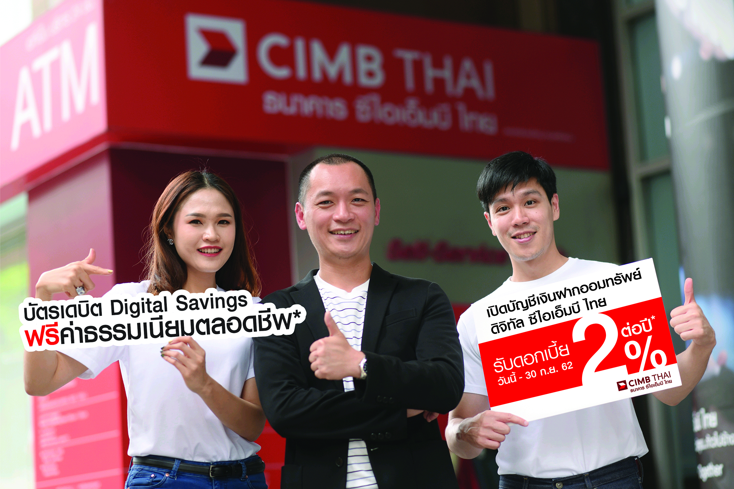 3 กันยายน 2562 : ธนาคาร ซีไอเอ็มบี ไทย เสนอโปรแกรม เงินฝากออมทรัพย์ ดิจิทัล ซีไอเอ็มบี ไทย รับดอกเบี้ยสูงถึง 2% ต่อปี เมื่อฝากเงินตั้งแต่ 500-100,000 บาท ตั้งแต่วันนี้ – 30 ก.ย. 2562 เพื่อตอบโจทย์กลุ่มลูกค้าที่มีไลฟ์สไตล์ในปัจจุบัน ทั้งฝาก โอน จ่าย ถอน ทำรายการง่าย เพียงคลิ๊กเดียว ทั้งสะดวกสบายและปลอดภัย