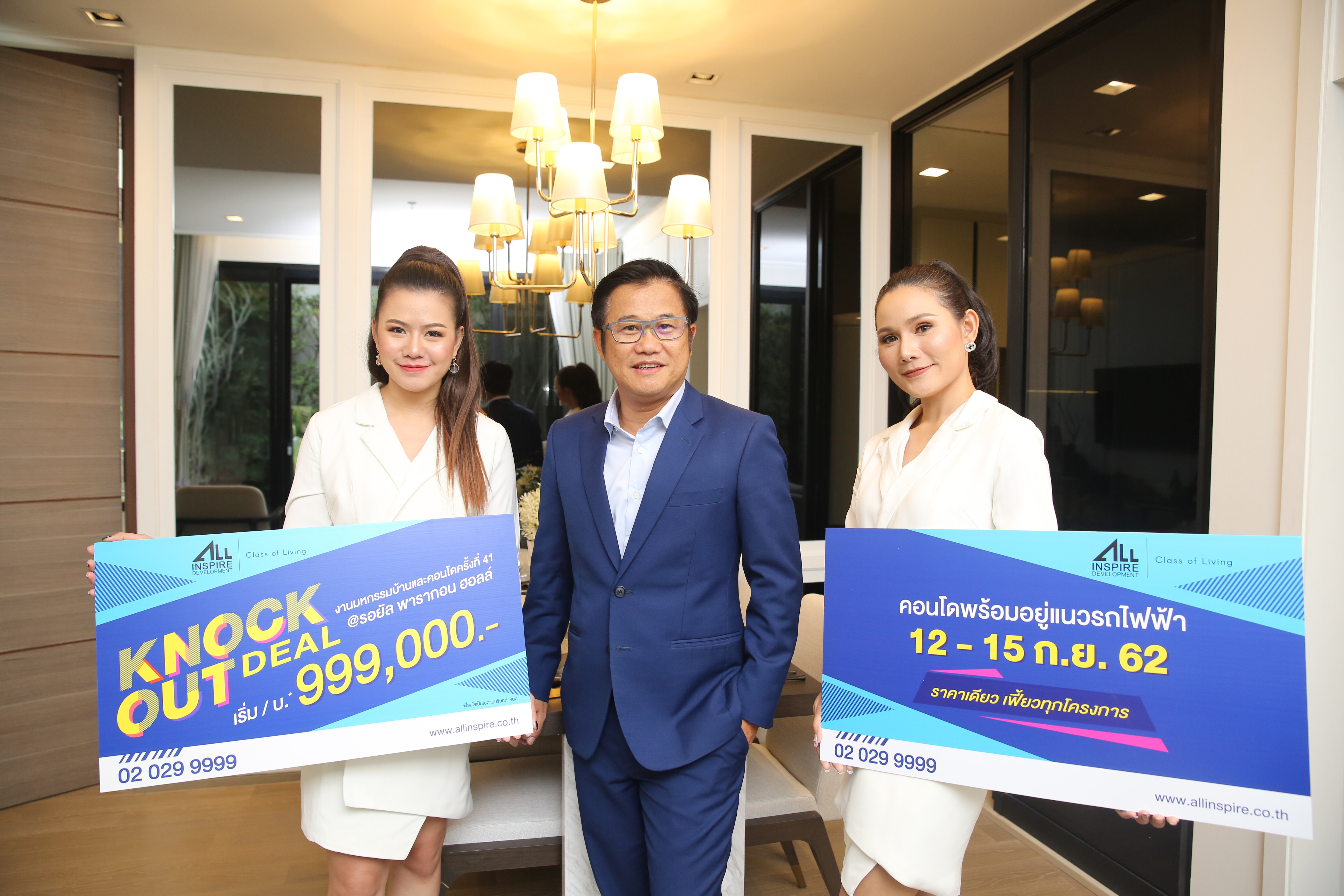 5 กันยายน 2562 : จัดโปรโมชั่นดีๆ เอาใจผู้ที่อยากช้อปที่อยู่อาศัยกันอีกแล้ว โดยนายธนากร ธนวริทธิ์ ประธานเจ้าหน้าที่บริหาร บมจ. ออลล์ อินสไปร์ ดีเวลลอปเม้นท์ (ALL) ระดม 10 โครงการคุณภาพทั้งทาวน์โฮมและคอนโดมิเนียม สุดยอดทำเล ใกล้รถไฟฟ้า มาจัดแคมเปญพิเศษ “KNOCK OUT DEAL ราคาเดียว เฟี้ยวทุกโครงการ” ในงานมหกรรมบ้านและคอนโด ครั้งที่ 41 ซึ่งจะจัดขึ้นระหว่างวันที่ 12 – 15 ก.ย. นี้ ในราคาเริ่มต้นที่ 999,000 บาท* (ขึ้นอยู่กับโครงการและเงื่อนไขของบริษัท) โครงการเข้าร่วมแคมเปญ ได้แก่