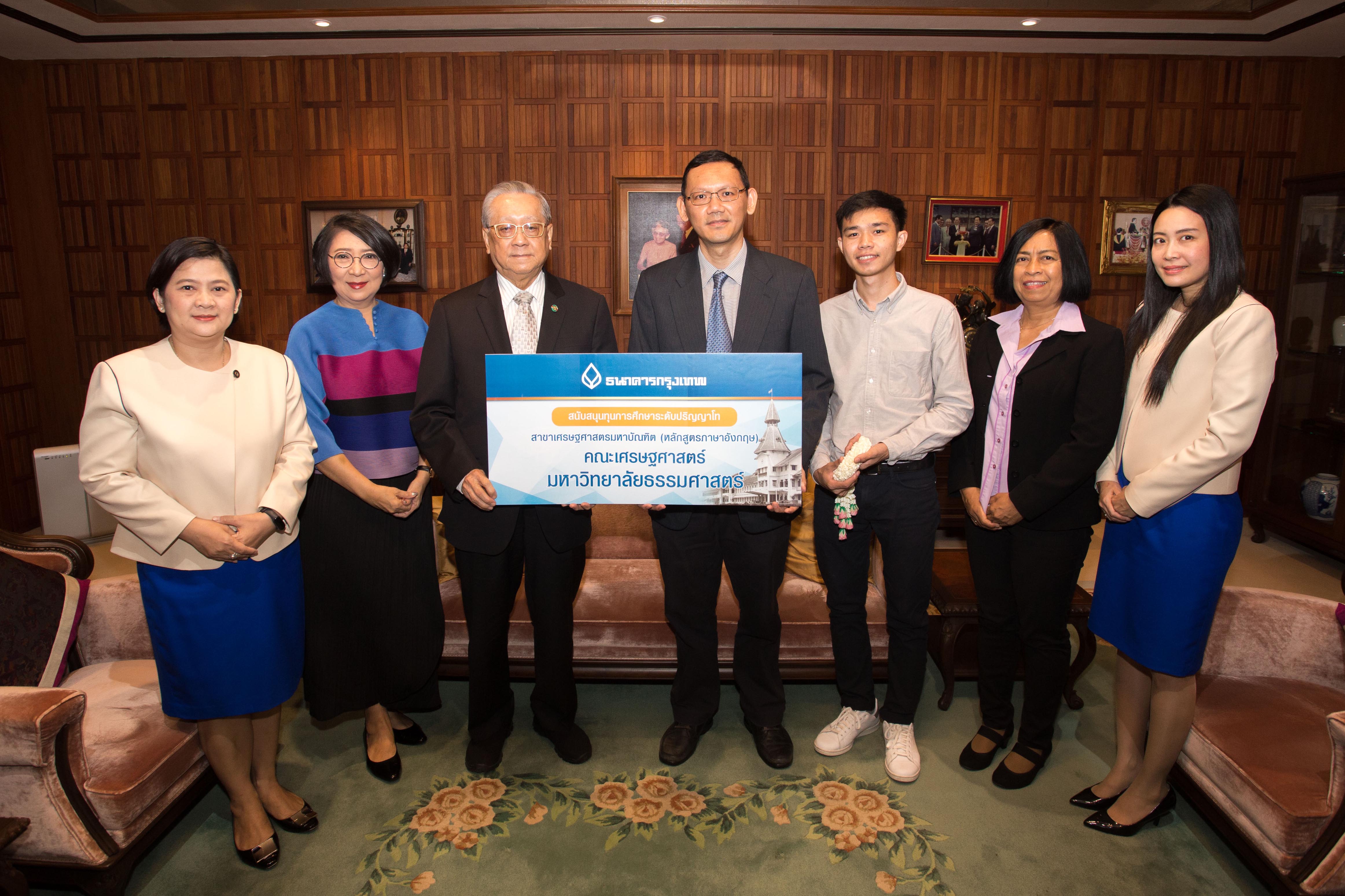 9 กันยายน 2562 : ปิติ สิทธิอำนวย (ที่ 3 จากซ้าย) ประธานกรรมการธนาคาร นางปฏิมา ชวลิต (ที่ 2 จากซ้าย) เจ้าหน้าที่บริหารระดับ Senior Vice President สายทรัพยากรบุคคล ศิริกุล ไชยสิงห์ (ซ้าย) ผู้จัดการภาคนครหลวง 9 ธนาคารกรุงเทพ จำกัด (มหาชน) ร่วมส่งมอบทุนการศึกษาระดับปริญญาโท หลักสูตรเศรษฐศาสตรมหาบัณฑิต สาขาวิชาเศรษฐศาสตร์ธุรกิจ (ภาคภาษาอังกฤษ) คณะเศรษฐศาสตร์ มหาวิทยาลัย ธรรมศาสตร์ ประจำปี 2562 แก่นายอรรณพ แจ้วิสอน (ที่ 3 จากขวา) นักศึกษาระดับปริญญาโท ชั้นปีที่ 2 ผู้ได้รับทุน