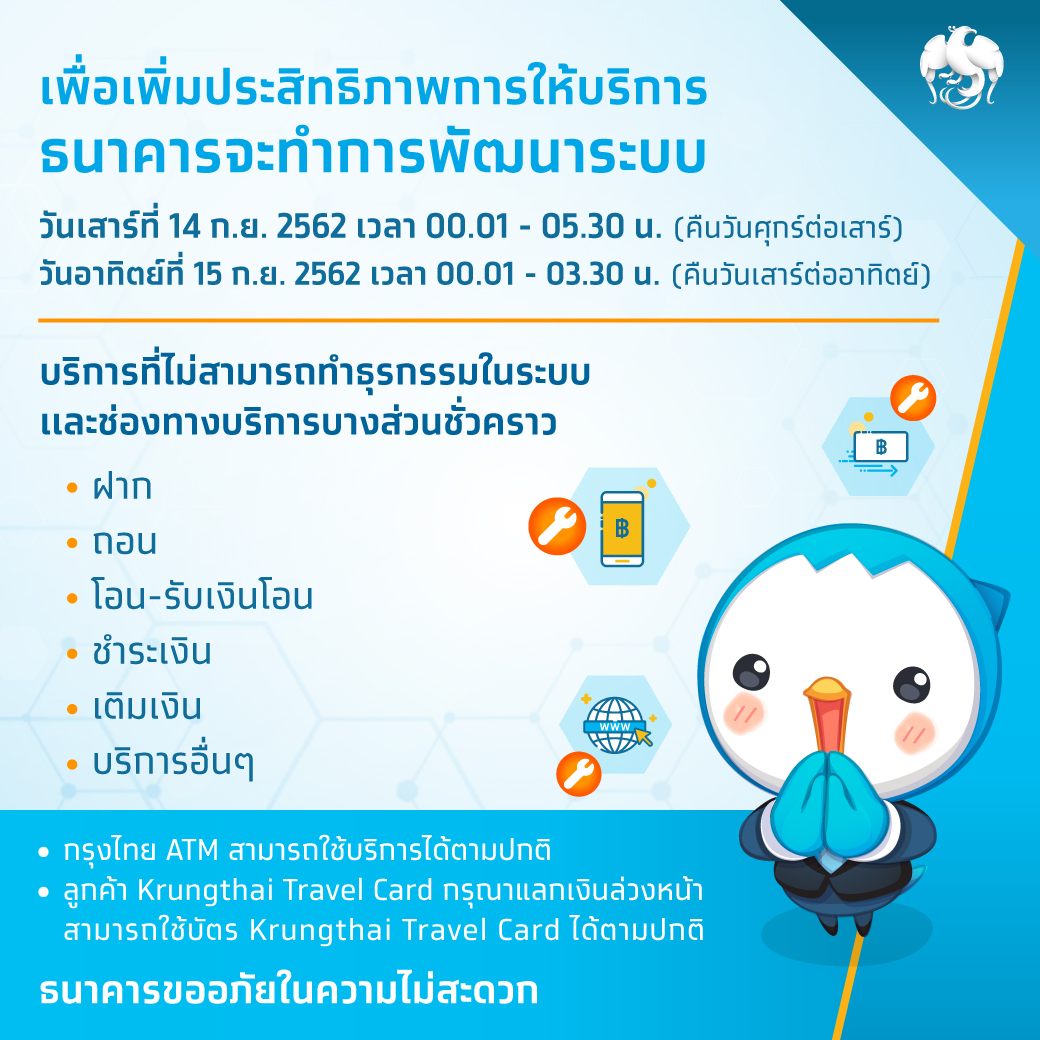 12 กันยายน 2562 : ธนาคารกรุงไทย เพิ่มประสิทธิภาพการให้บริการ ปรับปรุงระบบงานอิเล็กทรอนิกส์ ส่งผลให้ลูกค้าไม่สามารถใช้บริการบางประเภทชั่วคราว ในวันเสาร์ที่ 14 กันยายน 2562 ระหว่างเวลา 00.01 – 05.30 น. ได้แก่ แอปพลิเคชั่นเป๋าตัง กรุงไทย NEXT กรุงไทย Government กรุงไทย Connext กรุงไทย Corporate Online กรุงไทย PromptPay กรุงไทย Verified by VISA กรุงไทย SMS Alert กรุงไทย CO-OP กรุงไทย Fleet Card กรุงไทย Cash Card