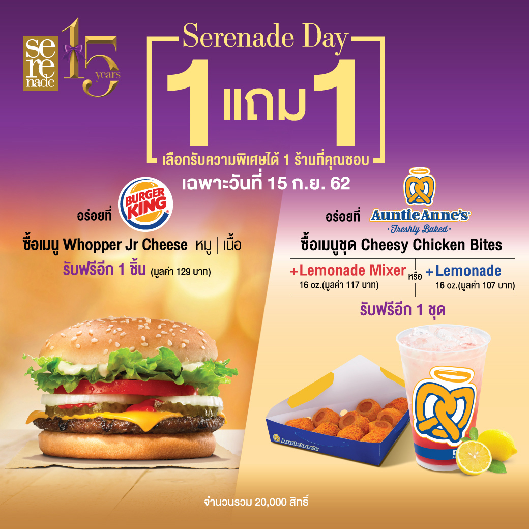 13 กันยายน 2562 : คัดสรรมาให้คุ้มอย่างต่อเนื่อง กับเทศกาล Serenade Day ทุกวันที่ 15 ของทุกเดือน ในโอกาสฉลองครบรอบ 15 ปี Serenade สุดยิ่งใหญ่ และในเดือนกันยายนนี้ ความพิเศษยังทวีคูณขึ้นอีก กับเมนูยอดนิยมจาก 2 ร้านดัง Burger King และ Auntie Anne’s กับดีลสุดปัง ซื้อ 1 แถมฟรีอีก 1 จัดให้เฉพาะลูกค้าเซเรเนด 1 หมายเลข ต่อ 1 สิทธิ์ (จำนวนจำกัด) ทุกสาขาที่ร่วมรายการ เฉพาะวันที่ 15 กันยายน 2562 นี้ เท่านั้น!