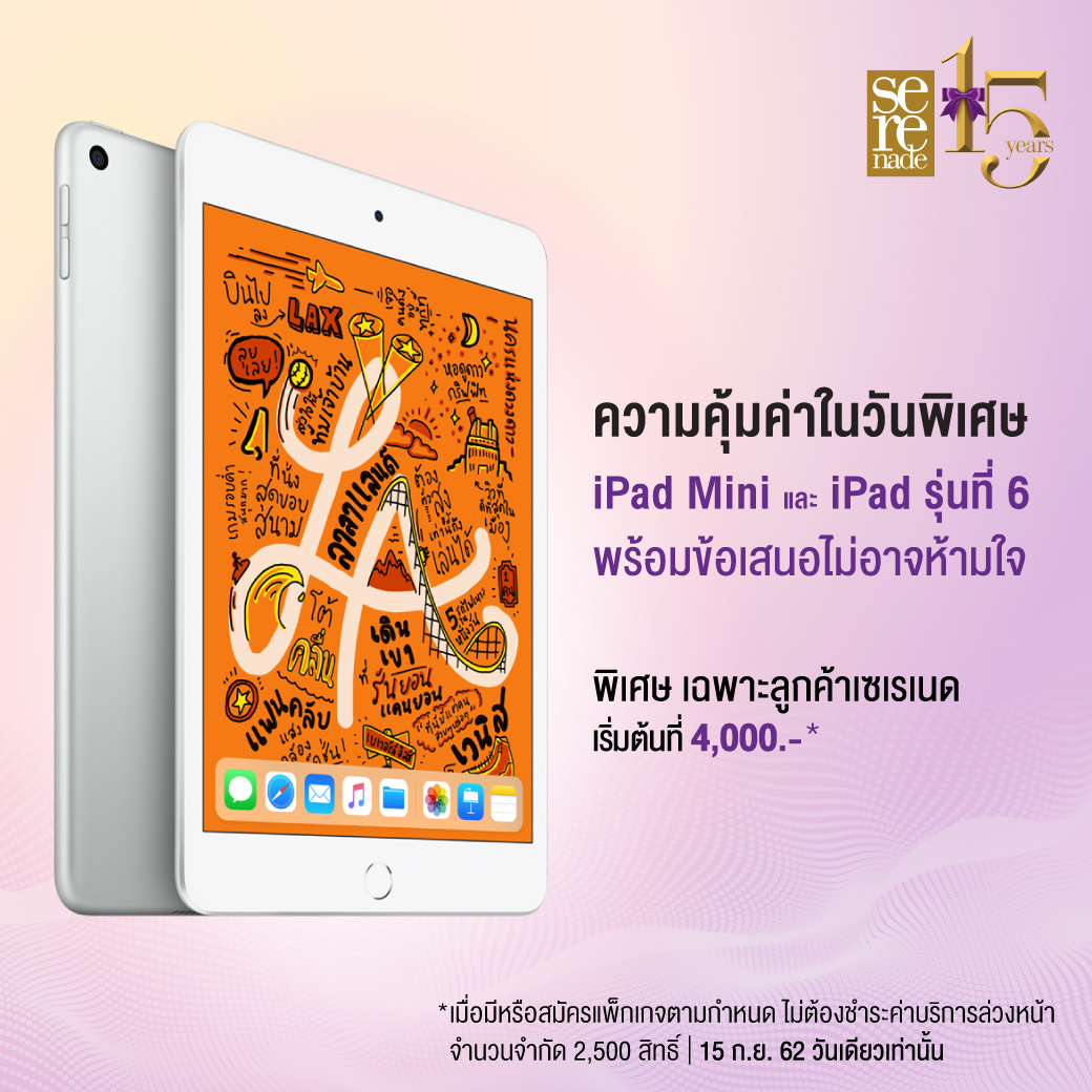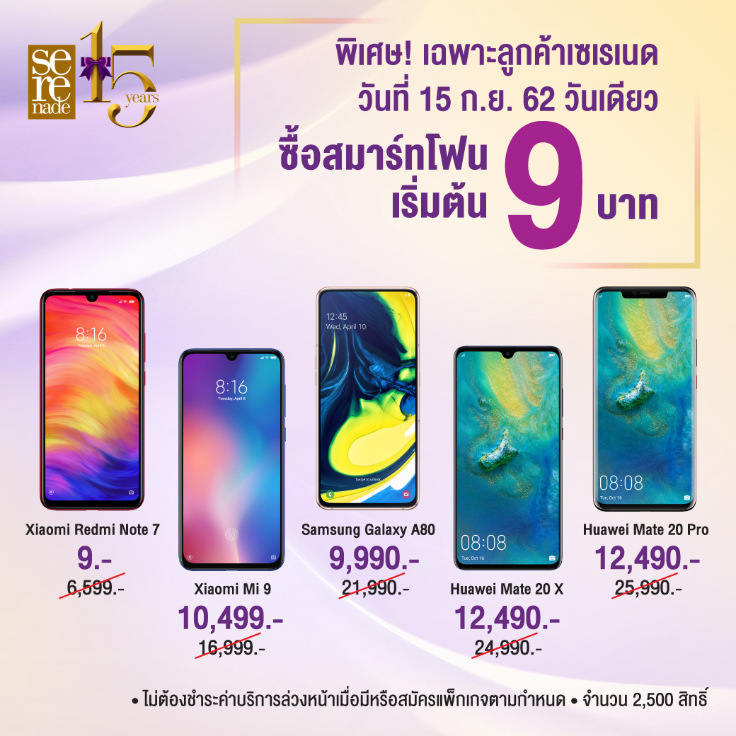 ยังไม่หมดเพียงเท่านี้ ลูกค้าเซเรเนด ยังได้รับสิทธิ์เลือกซื้อสมาร์ทโฟนรุ่นยอดฮิตในราคาพิเศษ มากกว่าที่เคย (จำนวนจำกัด) ในวันที่ 15 กันยายนนี้ วันเดียวเท่านั้น ที่ AIS Shop และ Serenade Club สาขาที่ร่วมรายการ