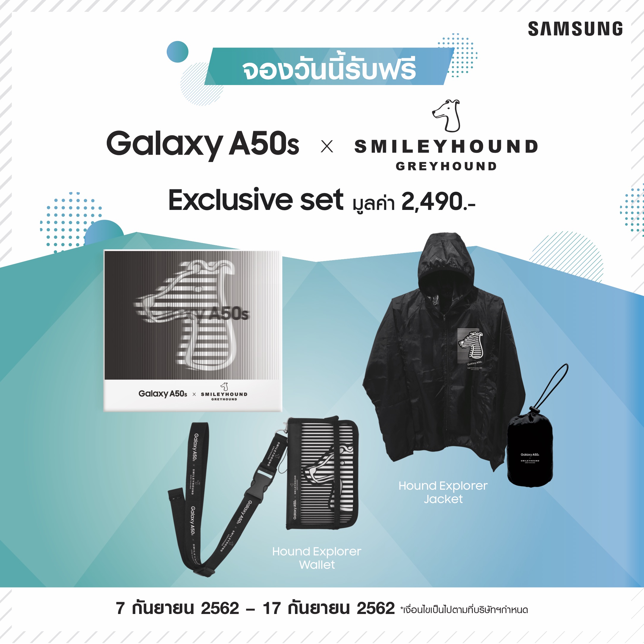 โดยสินค้าเอ็กซ์คลูซีฟเซ็ต Galaxy A50s x SMILEYHOUND จะประกอบด้วย Hound Explorer Wallet กระเป๋าสตางค์สุดเท๋และ Hound Explorer Jacket ยูวีแจ๊คเก็ตผ้าร่มสุดคูล มูลค่ารวม 2,490 บาทนี้ สำหรับคนที่สั่งซื้อในช่วงเปิดจองระหว่างวันที่ 7-17 กันยายนนี้เท่านั้น