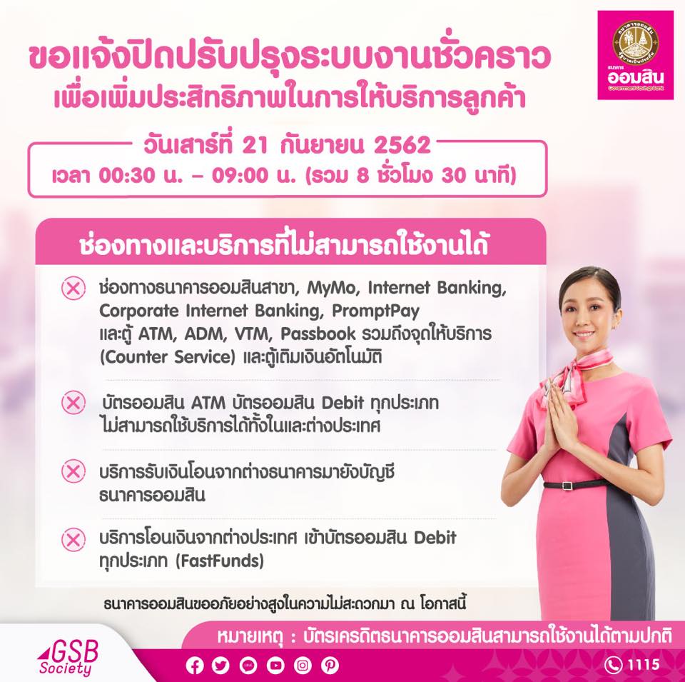 14 กันยายน 2562 : ดร.ชาติชาย พยุหนาวีชัย ผู้อำนวยการธนาคารออมสิน เปิดเผยว่า ตามที่ธนาคารฯ จะดำเนินการโอนย้ายระบบงาน CBS ไปยังเครื่องคอมพิวเตอร์แม่ข่ายระบบ CBS ชุดใหม่ เพื่อเป็นการเพิ่มประสิทธิภาพในการให้บริการลูกค้ามากยิ่งขึ้น ธนาคารฯ จึงขอแจ้งปิดระบบงาน CBS เป็นการชั่วคราว ในวันเสาร์ที่ 21 กันยายน 2562 เวลา 00.30 – 09.00 น. (รวม 8 ชั่วโมง 30 นาที)