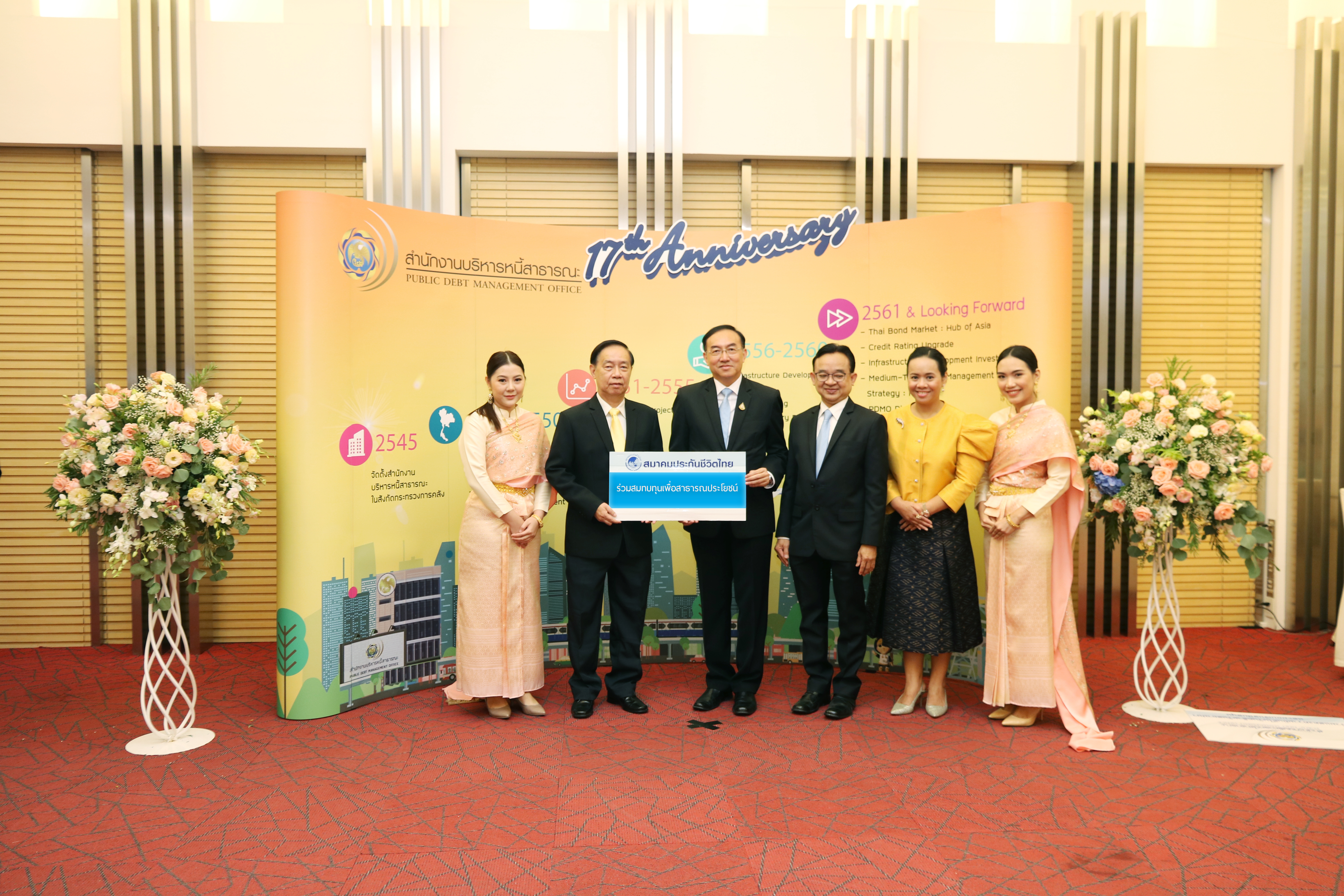 17 กันยายน 2562 : สมาคมประกันชีวิตไทย โดย นายพิชา สิริโยธิน ผู้อำนวยการบริหารสมาคมประกันชีวิตไทย ร่วมแสดงความยินดีกับสำนักงานบริหารหนี้สาธารณะ เนื่องในวันคล้ายวันสถาปนา สบน. ครบรอบ 17 ปี พร้อมร่วมสมทบทุนเพื่อสาธารณประโยชน์ โดยมีนายภูมิศักดิ์ อรัญญาเกษมสุข ผู้อำนวยการสำนักงานบริหารหนี้สาธารณะ ให้การต้อนรับณ ห้องประชุมวายุภักษ์ 4 ชั้น 4 อาคารสำนักงานปลัดกระทรวงการคลัง ถนนพระรามที่ 6 กรุงเทพฯ เมื่อวันที่ 17 กันยายน 2562 ![]()