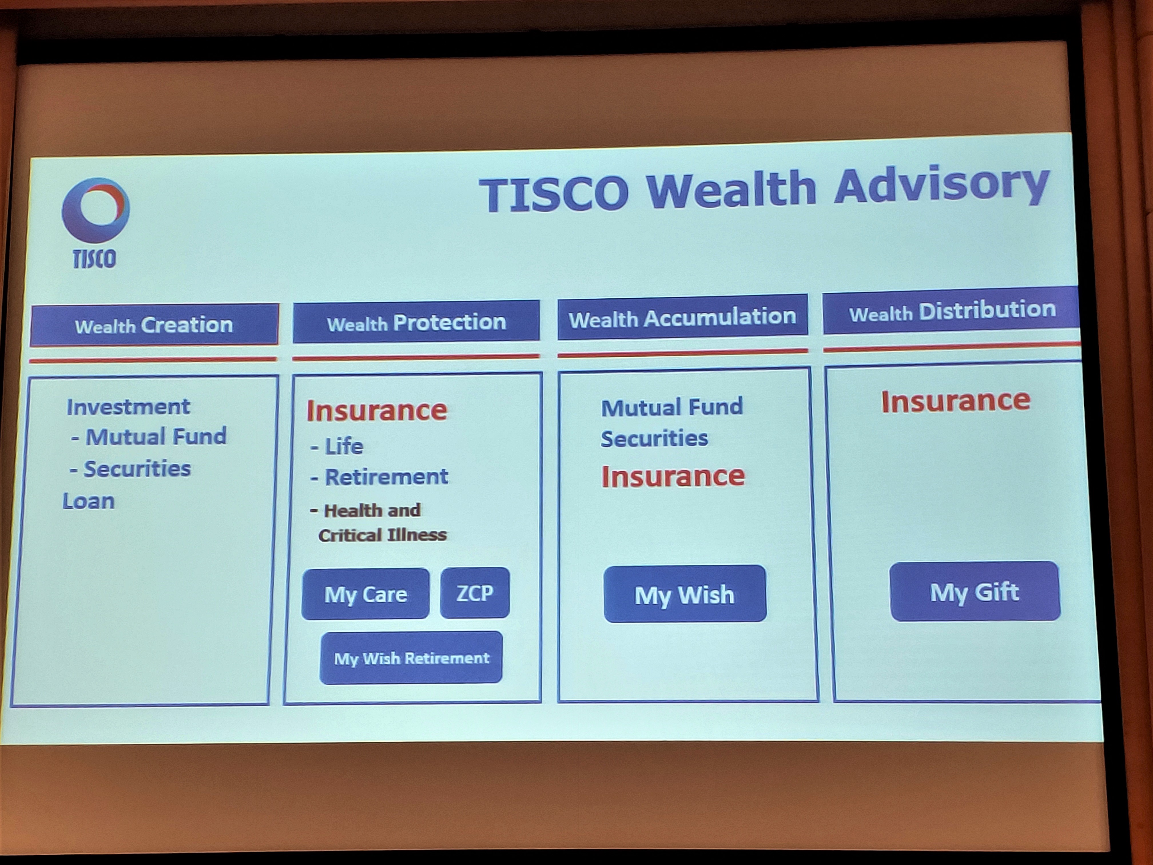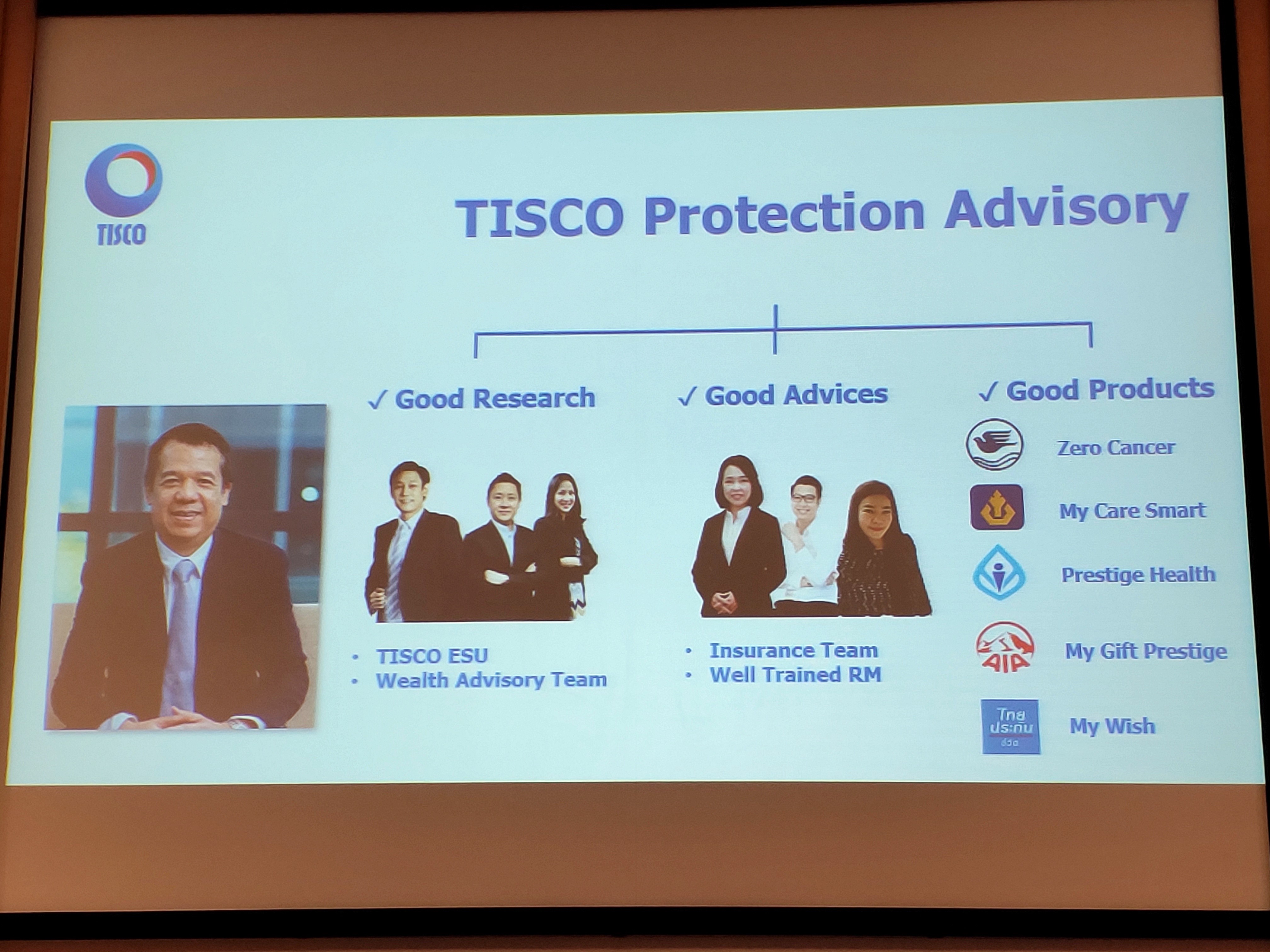“การทำประกันสุขภาพถือเป็นสิ่งจำเป็นในยุคนี้ และจะจำเป็นขึ้นเรื่อยๆ เพราะค่าใช้จ่ายด้านการรักษาพยาบาลแพงขึ้นทุกวัน ต้องยอมรับว่าการจะเลือกซื้อประกันสุขภาพที่คุ้มค่าก็ไม่ง่ายนักสำหรับลูกค้า ต้องศึกษาข้อมูลทำความเข้าใจรายละเอียดเปรียบเทียบความคุ้มครองแต่ละแบบ ทิสโก้เราสนใจศึกษาตลาดมาหลายปี ที่ผ่านมาได้คัดเลือกผลิตภัณฑ์เด่นๆ จากบริษัทประกันชั้นนำ มาแนะนำให้กับลูกค้าระยะหนึ่งแล้ว เช่น ประกันมะเร็ง ประกันสุขภาพแบบเหมาจ่าย มีการจัดสัมนาเชิญวิทยากรทางการแพทย์มาร่วมเสวนาให้ความรู้กับลูกค้า ซึ่งลูกค้าสนใจมากให้การตอบรับเป็นอย่างดี