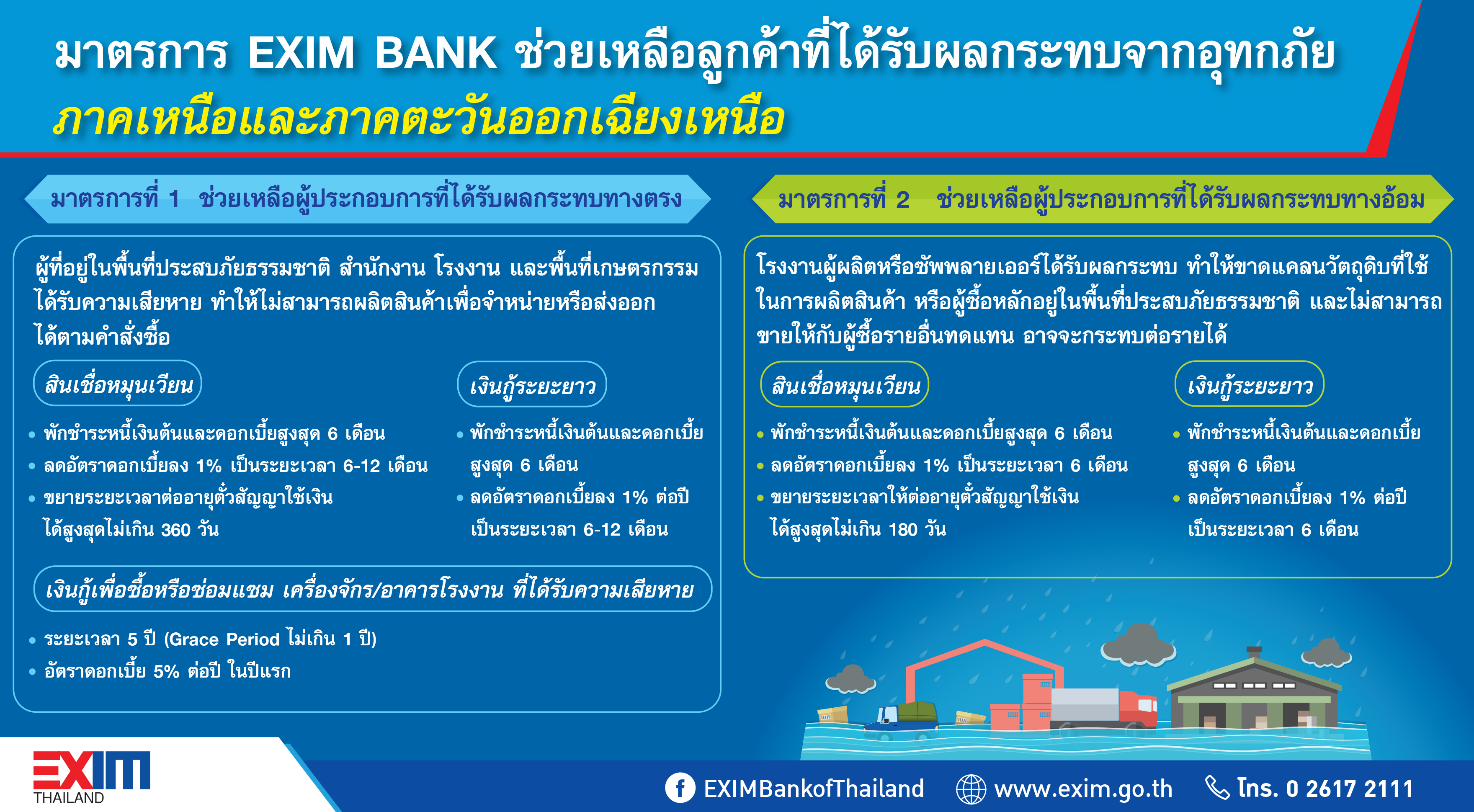 3. สามารถขอเงินกู้เพื่อซื้อหรือซ่อมแซมเครื่องจักรหรืออาคารโรงงานที่ได้รับความเสียหาย ระยะเวลานาน 5 ปี ปลอดชำระเงินต้นและดอกเบี้ย (Grace Period) ไม่เกิน 1 ปี อัตราดอกเบี้ย 5% ต่อปีในปีแรก และพิจารณาตามความเหมาะสมในปีต่อไป