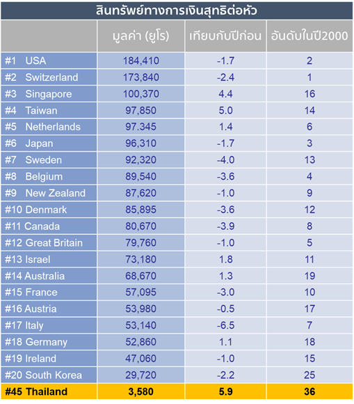 ผลมาจากสินทรัพย์ที่ซบเซาและหนี้สินที่เพิ่มขึ้น ทำให้สินทรัพย์ทางการเงินสุทธิในประเทศไทยลดลง 5.6% ในปี 2561 ด้วยสินทรัพย์ทางการเงินสุทธิต่อหัวอยู่ที่ 3,580 ยูโร (ประมาณ 122,150 บาท) อันดับของประเทศไทยลดลงหนึ่งขั้นมาอยู่ที่อันดับ 45 ในการจัดอันดับประเทศที่ร่ำรวยที่สุด (สินทรัพย์ทางการเงินต่อหัว ดูตารางด้านล่าง) ลำดับสูงสุด คือ สหรัฐอเมริกาแซงหน้าสวิตเซอร์แลนด์อีกครั้งด้วยค่าเงินดอลลาร์ที่แข็งค่า