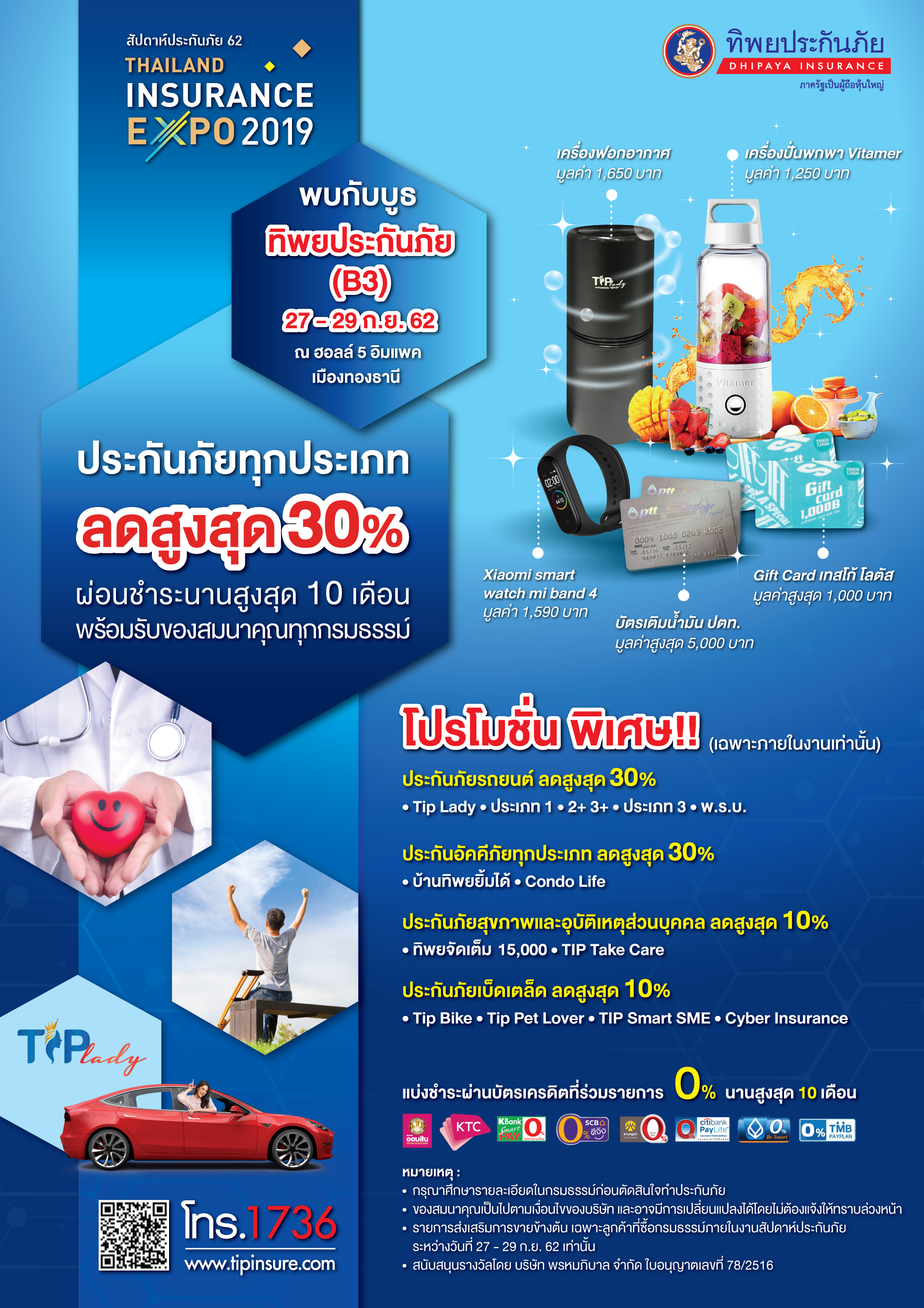 24 กันยายน 2562 : ทิพยประกันภัย ขนโปรโมชั่นพิเศษสุดๆ สำหรับผลิตภัณฑ์ประกันภัยมากมาย มาให้ผู้ที่สนใจเลือกซื้อ เฉพาะในงาน “สัปดาห์ประกันภัย” ประจำปี 2562 (Thailand Insurance Expo 2019) มอบส่วนลดประกันภัยทุกประเภท สูงสุดถึง 30 % ผ่อนชำระนานถึง 10 เดือน ผ่านบัตรเครดิตที่ร่วมรายการ และของสมนาคุณพิเศษมากมาย อาทิ ประกันภัยรถยนต์สำหรับผู้หญิง TIP Lady รับส่วนลดพิเศษพร้อมรับบัตรเติมน้ำมันสูงสุดถึง 5,000 บาท และเครื่องฟอกอากาศ หรือเมื่อซื้อประกันภัยอื่นๆ รับเครื่องปั่นพกพา ,Smart Watch และอื่นๆอีกมากมาย สำหรับผู้ที่แวะมาลงทะเบียนที่บูธทิพยประกันภัย รับฟรีประกันภัยอุบัติเหตุ ความคุ้มครอง 100,000 บาท นาน 30 วัน แล้วพบกันที่ บูธ B3 วันที่ 27 – 29 กันยายน นี้ ณ ฮอลล์ 5 อิมแพค เมืองทองธานี ![]()