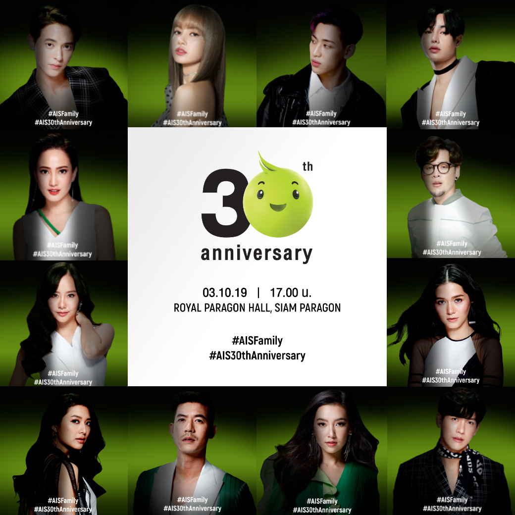 28 กันยายน 2562 : เอไอเอส ฉลองครบ 30 ปี จัดงานแถลงข่าวและขอบคุณลูกค้าสุดยิ่งใหญ่ ในวันพฤ.ที่ 3 ตุลาคม 2562 เวลา 17.00 น. ณ รอยัล พารากอน ฮอลล์ ชั้น 5 สยามพารากอน พบกับการรวมตัวของ 12 พรีเซนเตอร์สุดฮอต ได้แก่ เจมส์ จิรายุ, เป็ก ผลิตโชค, ทอม อิศรา, เต้ย จรินทร์พร, แต้ว ณฐพร, มิว นิษฐา, พุฒ พุฒิชัย, วี วิโอเลต, เวียร์ ศุกลวัฒน์, เบลล่า ราณี, แบมแบม กันต์พิมุกต์, ลิซ่า ลลิษา ที่จะมามอบความสุขและความสนุกครั้งยิ่งใหญ่ ที่ทำให้ทุกคนอุ่นใจยิ่งกว่าเดิม