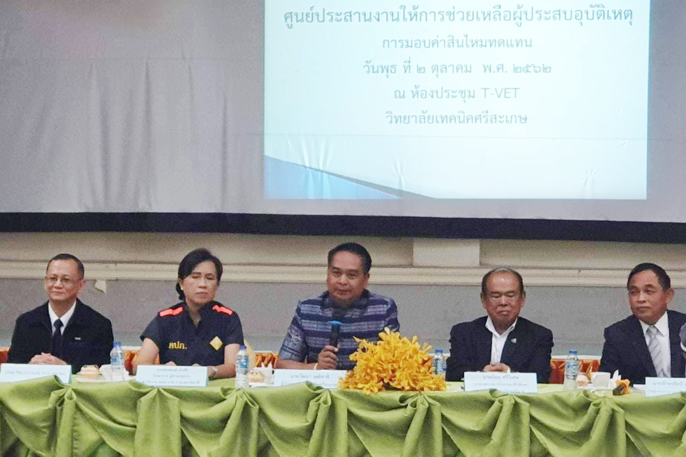 3 ตุลาคม 2562 : วัฒนา พุฒิชาติ ผู้ว่าราชการจังหวัดศรีสะเกษ ในฐานะประธานในพิธี ร่วมกับ พรพยงค์ บัวศรี รักษาการผู้อำนวยการสำนักงาน คปภ. ภาค 5 (จ.อุบลราชธานี) และ บริษัท วิริยะประกันภัย จำกัด (มหาชน) โดยมี สมชาย เกษมทวีศักดิ์ รองผู้จัดการฝ่ายปฏิบัติการภาค 2 (ภาคตะวันออกเฉียงเหนือ) เป็นผู้แทนบริษัทฯ ร่วมชี้แจงการช่วยเหลือผู้ประสบภัยในนามศูนย์ประสานงานการให้ความช่วยเหลือผู้ประสบอุบัติเหตุ และดำเนินพิธีการมอบสินไหมทดแทน ให้แก่ครอบครัวของของนักศึกษาวิทยาลัยเทคนิคศรีสะเกษที่ประสบอุบัติเหตุเสียชีวิต จากอุบัติเหตุรถกระบะเสียหลักพุ่งชนเสาไฟฟ้าและพลิกคว่ำ บริเวณถนนกิ่งแก้ว อำเภอบางพลี จังหวัดสมุทรปราการ