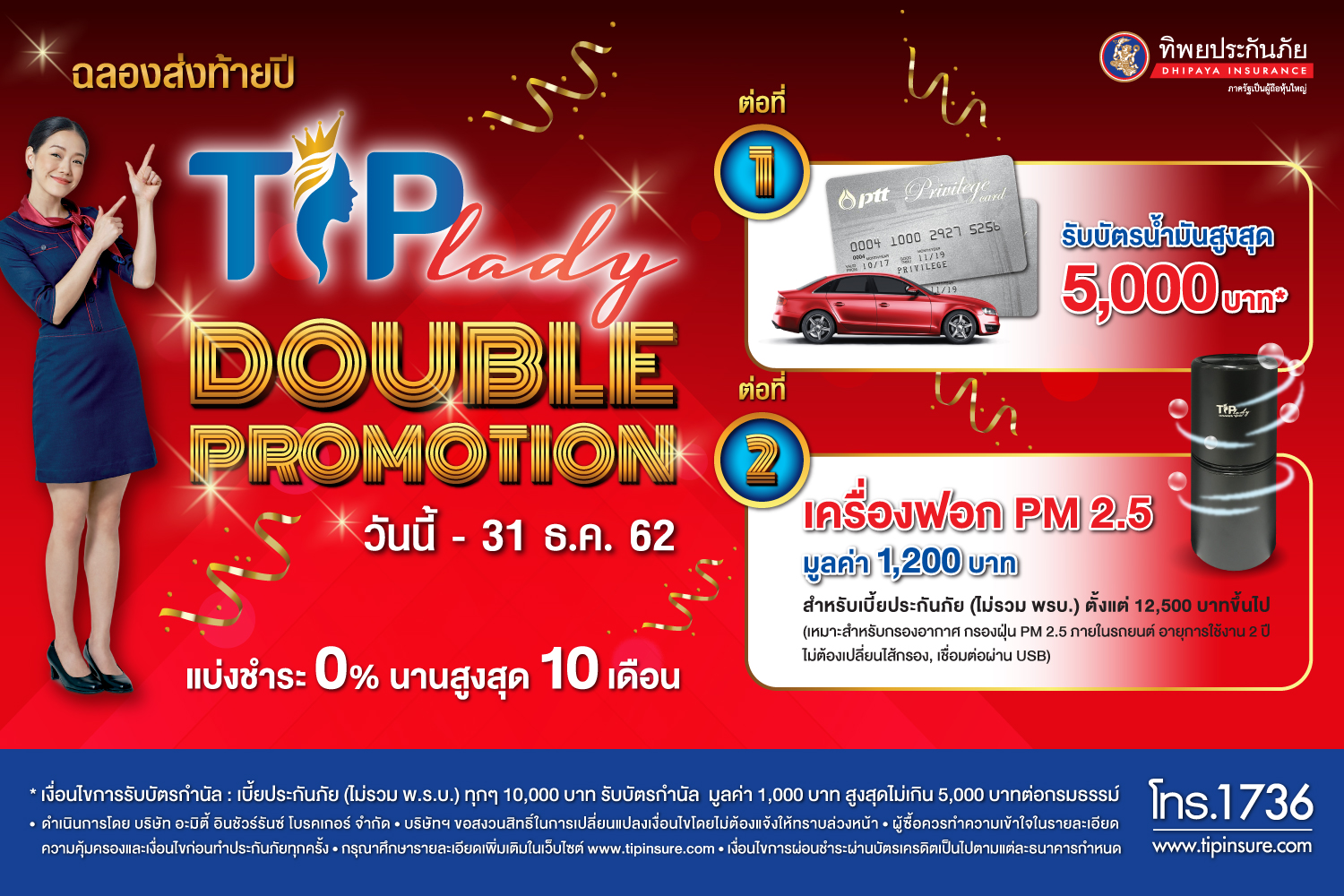 5 ตุลาคม 2562 : ทิพยประกันภัย มอบความสุขฉลองส่งท้ายปี กับประกันภัยรถยนต์ TIP Lady ที่ให้มากกว่าประกันชั้น 1 กับแคมเปญ “TIP Lady Double Promotion” พิเศษสุดคุ้ม เพียงซื้อกรมธรรม์ประกันภัย TIP Lady รับ