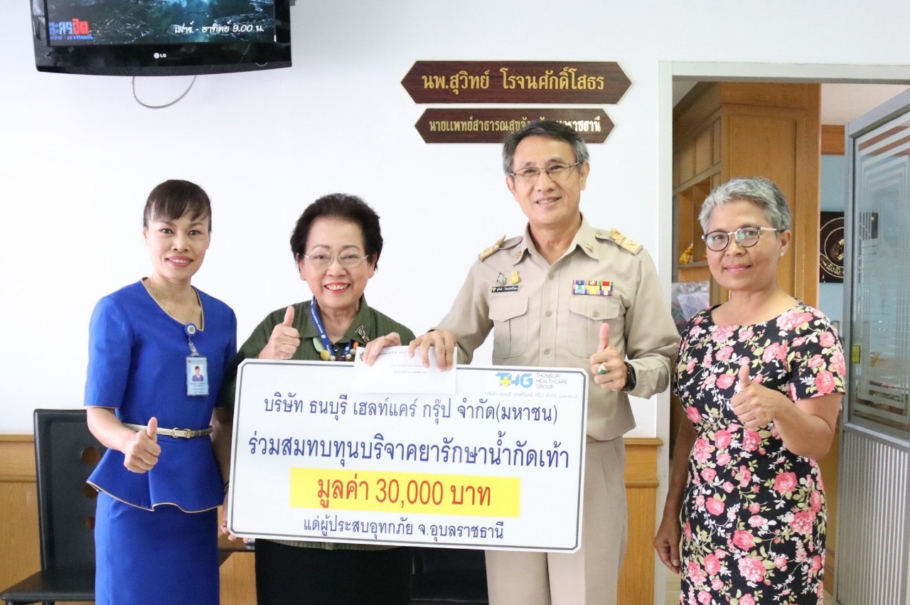 7 ตุลาคม 2562 : พญ. วิภาดา เชาวกุล (ที่ 2 จากซ้าย) ผู้อำนวยการฝ่ายบริหาร โรงพยาบาลอุบลรักษ์ ธนบุรี เป็นผู้แทน บริษัท ธนบุรี เฮลท์แคร์ กรุ๊ป จำกัด (มหาชน) หรือ THG มอบเงินบริจาคและผลิตภัณฑ์ยารักษาโรคน้ำกัดเท้าให้แก่ นพ. สุวิทย์ โรจนศักดิ์โสธร นายแพทย์สาธารณสุขจังหวัดอุบลราชธานี เพื่อนำไปให้ความช่วยเหลือแก่ผู้ประสบอุทกภัยในจังหวัดอุบลราชธานี หลังได้รับผลกระทบจากเหตุการณ์น้ำท่วมครั้งใหญ่ในรอบ 17 ปี ![]()