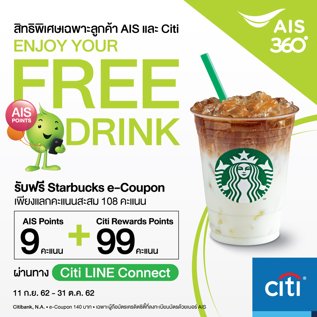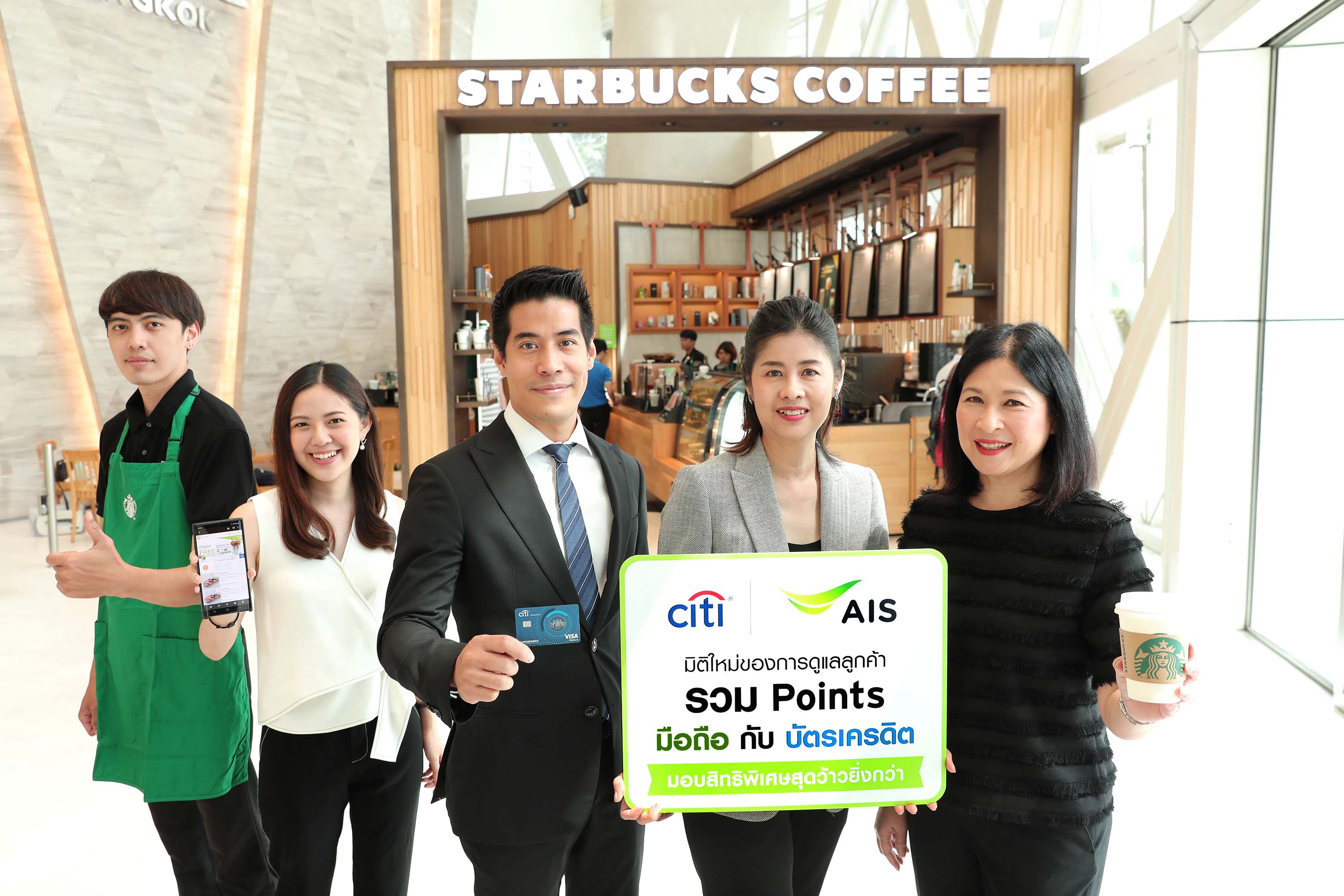 จัดแคมเปญพิเศษ ครั้งแรกของเมืองไทยในการรวมพอยท์จากการใช้งานโทรศัพท์มือถือ และบัตรเครดิตเข้าด้วยกัน เพื่อให้ลูกค้า AIS และ AIS Fibre ที่ใช้บัตรเครดิต Citibank สามารถนำ AIS Points เพียง 9 พอยท์ มารวมกับ Citi Rewards Points 99 พอยท์ รวมเป็น 108 พอยท์ แลกรับฟรี Starbucks e-Coupon มูลค่า 140 บาท มอบความคุ้มค่ายิ่งกว่าในการใช้ AIS Points ตอกย้ำแนวคิดด้านการดูแลลูกค้าที่แตกต่าง ตอบไลฟ์สไตล์ลูกค้าทุกเจเนอเรชั่น
