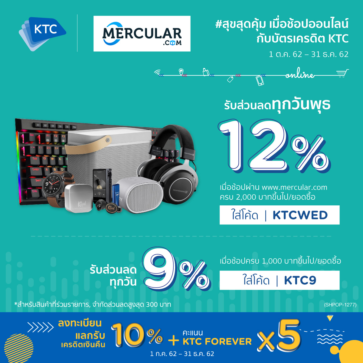 8 ตุลาคม 2562 : “เคทีซี” หรือ บริษัท บัตรกรุงไทย จำกัด (มหาชน) มอบข้อเสนอพิเศษสำหรับสมาชิกบัตรเครดิตเคทีซีที่ชื่นชอบเทคโนโลยีและความทันสมัย เมื่อซื้อสินค้าผ่านเว็บไซต์ www.mercular.com ระหว่างวันที่ 1 ตุลาคม 2562 – 31 ธันวาคม 2562 ในหมวดอุปกรณ์สมาร์ทแก็ดเจ็ต หูฟังและลำโพงที่ร่วมรายการ รับส่วนลด 9% ทุกวัน เมื่อซื้อสินค้าครบ 1,000 บาทขึ้นไปต่อยอดซื้อ และใส่โค้ด “KTC9” รับส่วนลด 12% ทุกวันพุธ เมื่อซื้อสินค้าครบ 2,000 บาทขึ้นไปต่อยอดซื้อ และใส่โค้ด “KTCWED” พิเศษรับเพิ่ม เครดิตเงินคืน 10% เมื่อชำระด้วยบัตรเครดิตเคทีซีพร้อมใช้คะแนน KTC FOREVER เท่ากับยอดใช้จ่ายออนไลน์ต่อรายการ และรับคะแนน KTC FOREVER 5 เท่า (คะแนนปกติ 1 เท่า และคะแนนพิเศษ 4 เท่า) เพียงลงทะเบียนรับสิทธิที่ www.ktc.co.th/shoponline ตั้งแต่วันที่ 1 กรกฎาคม 2562 – 31 ธันวาคม 2562