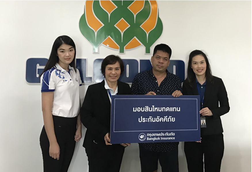 9 ตุลาคม 2562 : บริษัท กรุงเทพประกันภัย จำกัด (มหาชน) หรือ BKI โดย วรัญญา เทพสาร (ที่ 2 จากซ้าย) ผู้จัดการสาขาเชียงใหม่ ธุรกิจสาขาและการร่วมทุน เป็นผู้แทนบริษัทฯ มอบสินไหมทดแทนประกันอัคคีภัย จำนวน 11,269,696.18 บาท (สิบเอ็ดล้านสองแสนหกหมื่นเก้าพันหกร้อยเก้าสิบหกบาทสิบแปดสตางค์) ให้แก่บริษัท โกลคอนดา เอเชีย จำกัด ผู้เอาประกันภัย จากกรณีเกิดเหตุลมพายุ ทำให้สต๊อกสินค้าได้รับความเสียหาย