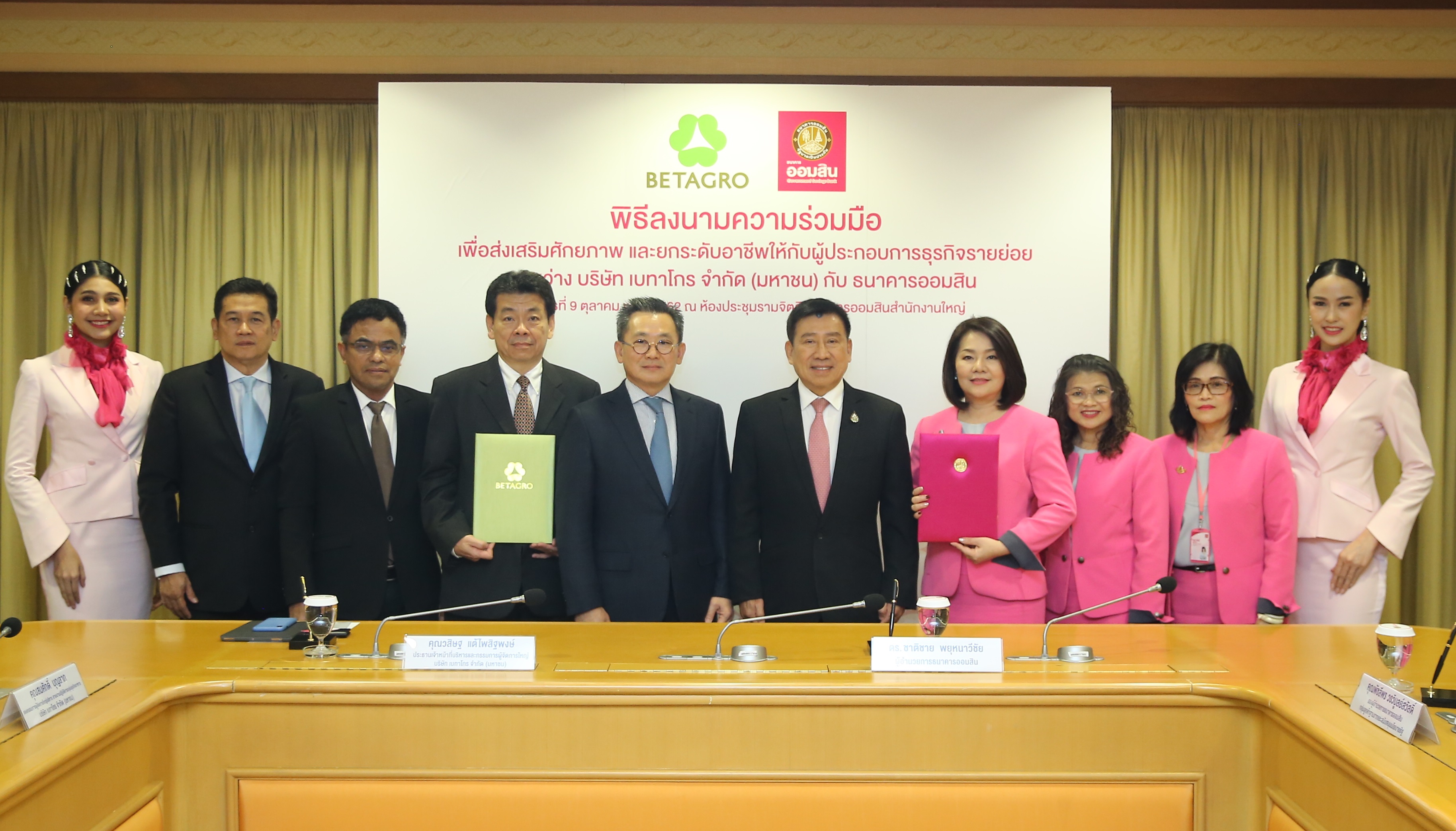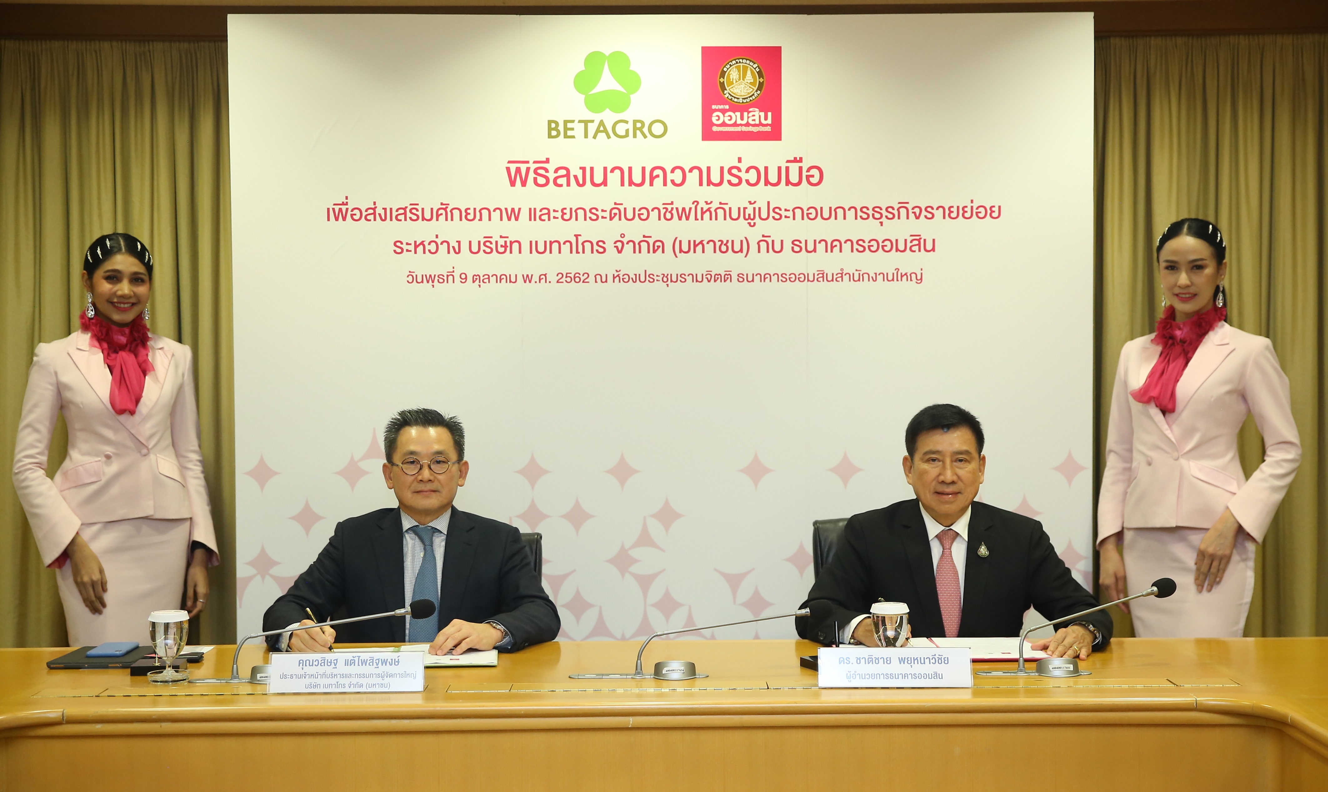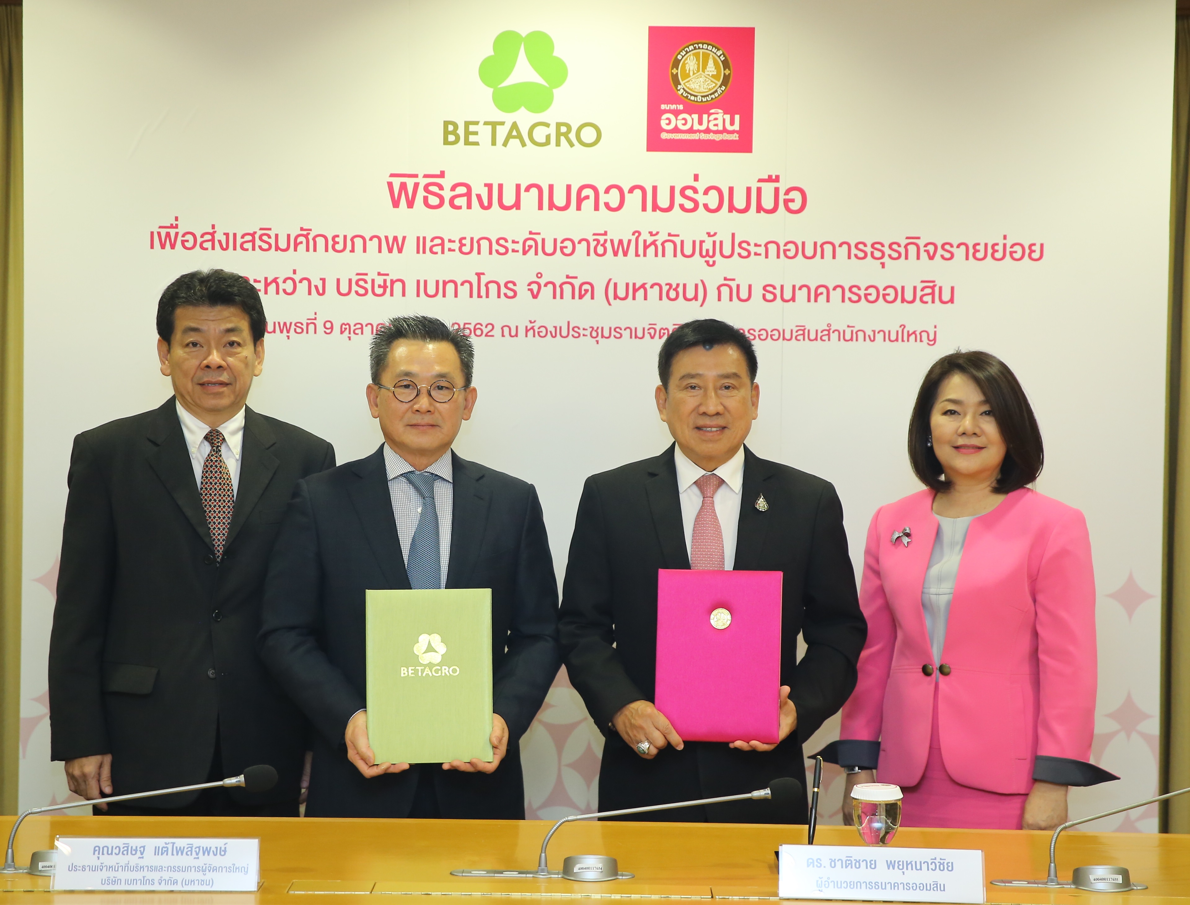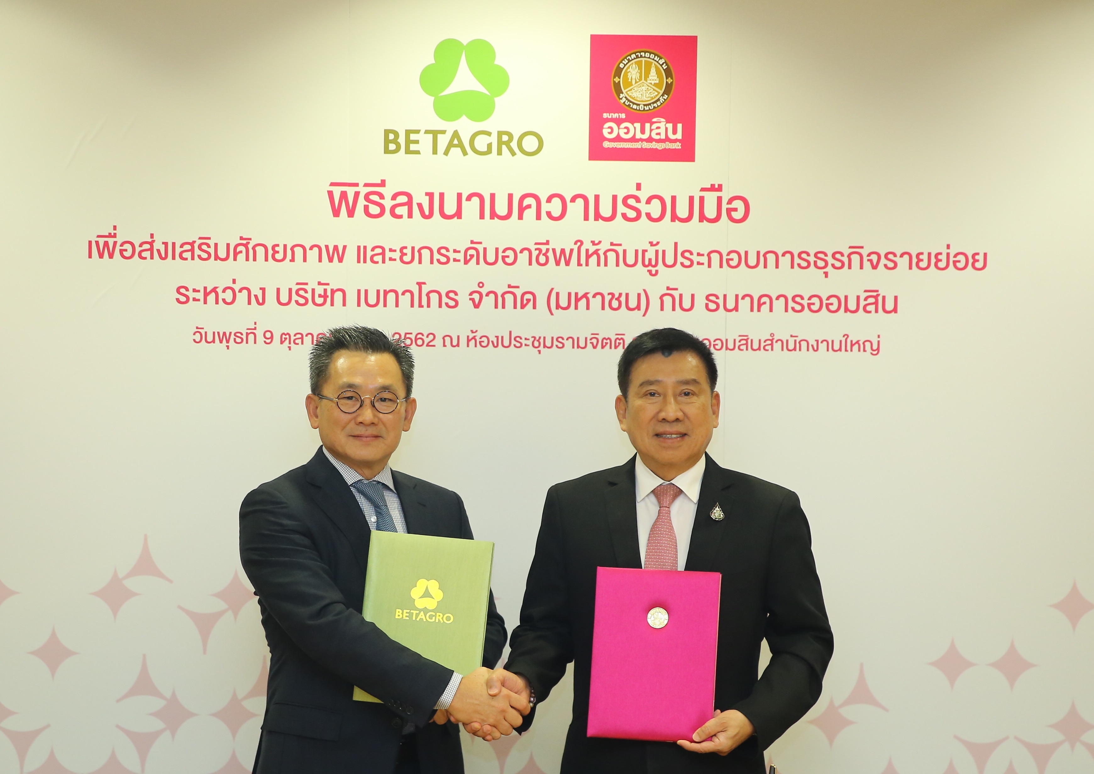 9 ตุลาคม 2562 : ดร.ชาติชาย พยุหนาวีชัย ผู้อำนวยการธนาคารออมสิน และ นายวสิษฐ แต้ไพสิฐพงษ์ ประธานเจ้าหน้าที่บริหารและกรรมการผู้จัดการใหญ่ บริษัท เบทาโกร จำกัด มหาชน ร่วมลงนามบันทึกข้อตกลงความร่วมมือ เพื่อส่งเสริมศักยภาพและยกระดับอาชีพให้กับผู้ประกอบการธุรกิจรายย่อย ซึ่งจะส่งผลต่อการพัฒนาคุณภาพชีวิตและระบบเศรษฐกิจฐานรากให้เติบโตได้อย่างมั่นคงและยั่งยืน ณ ห้องรามจิตติ ธนาคารออมสิน สำนักงานใหญ่ เมื่อวันที่ 9 ตุลาคม 2562