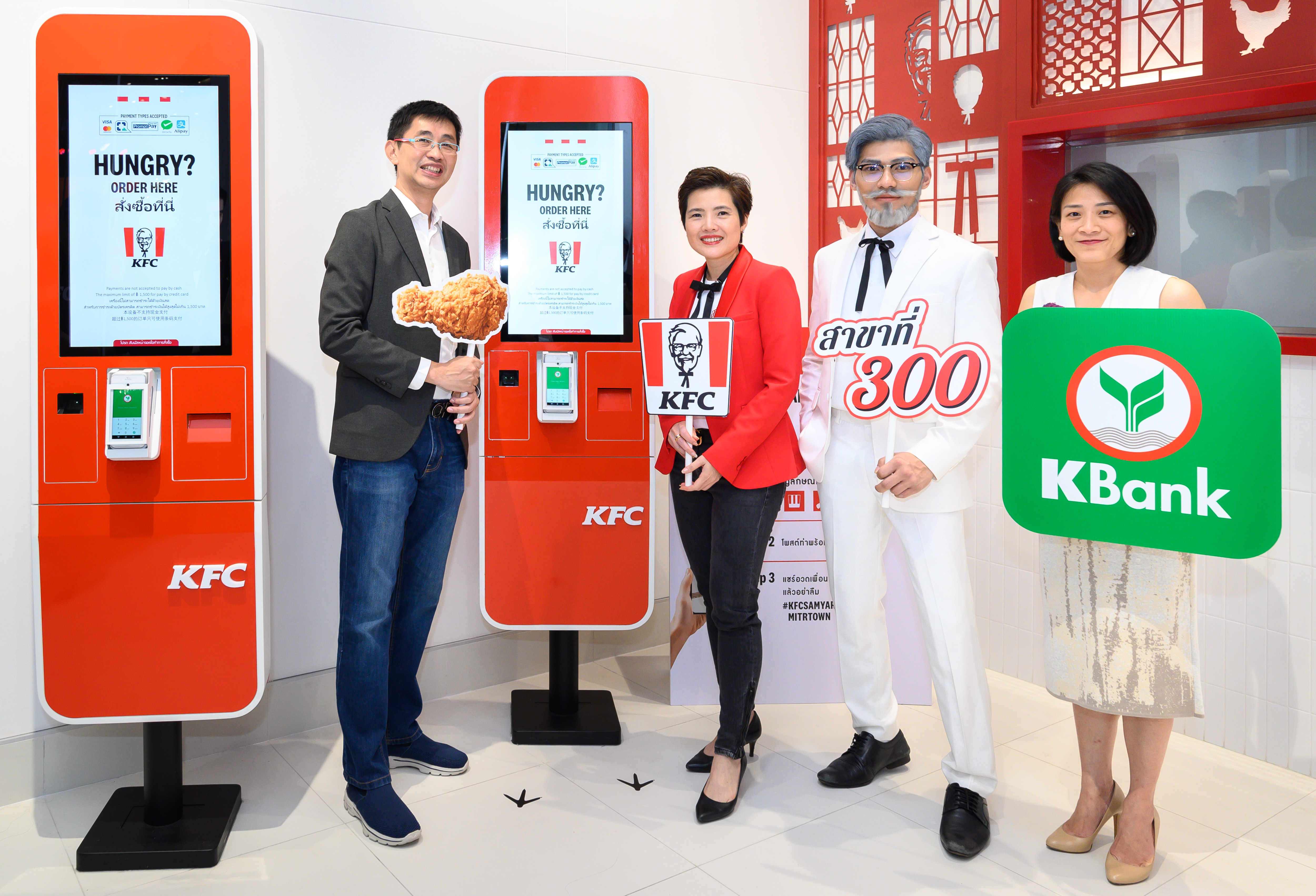 10 ตุลาคม 2562 : สุปรีชา ลิมปิกาญจนโกวิท (ซ้าย) ผู้ช่วยกรรมการผู้จัดการ ธนาคารกสิกรไทย และ ศสัย ตังเดชะหิรัญ (ที่ 2 จากซ้าย) กรรมการผู้จัดการ บริษัท เดอะ คิวเอสอาร์ ออฟ เอเชีย จำกัด ผนึกความร่วมมือหนุนสังคมไร้เงินสด เพิ่มความสะดวกและรวดเร็วให้ลูกค้าชำระค่าอาหารที่ร้าน เคเอฟซีผ่านบัตรเดบิต บัตรเครดิต และคิวอาร์โค้ด นำร่องสาขาแรกที่สามย่านมิตรทาวน์ เปิดให้บริการ 24 ชั่วโมง ตอบโจทย์ไลฟสไตล์คนรุ่นใหม่ให้สามารถชำระค่าอาหารผ่านคิวอาร์โค้ดได้ที่แคชเชียร์หรือตู้สั่งอาหารอัติโนมัติ (Self-Order Kiosk) โดยไม่ต้องรอนาน ![]()