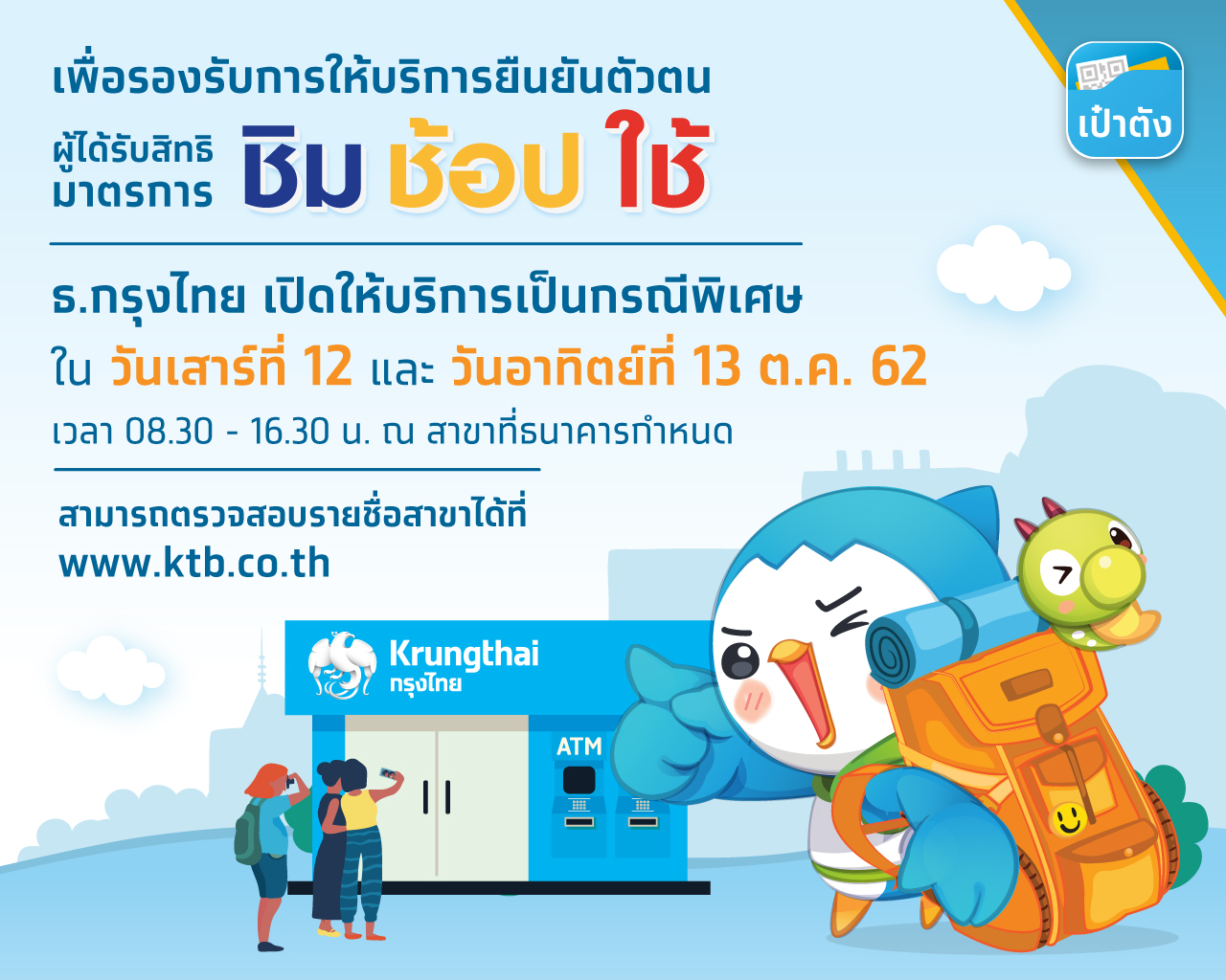 11 ตุลาคม 2562 : ธนาคารกรุงไทย แจ้งว่า เพื่ออำนวยความสะดวกให้กับประชาชนที่ได้รับสิทธิ์ร่วมมาตรการส่งเสริมการท่องเที่ยวในประเทศ ชิมช้อปใช้ ธนาคารจะเปิดให้บริการยืนยันตัวตนในแอปพลิเคชั่น เป๋าตัง เป็นกรณีพิเศษ ที่สาขา 204 แห่งทั่วประเทศ ในวันเสาร์และอาทิตย์ที่ 12-13 ตุลาคมนี้ ระหว่างเวลา 08.30-16.30 น. นอกเหนือจากสาขาในห้างสรรพสินค้าที่ให้บริการตามปกติอยู่แล้ว ![]()