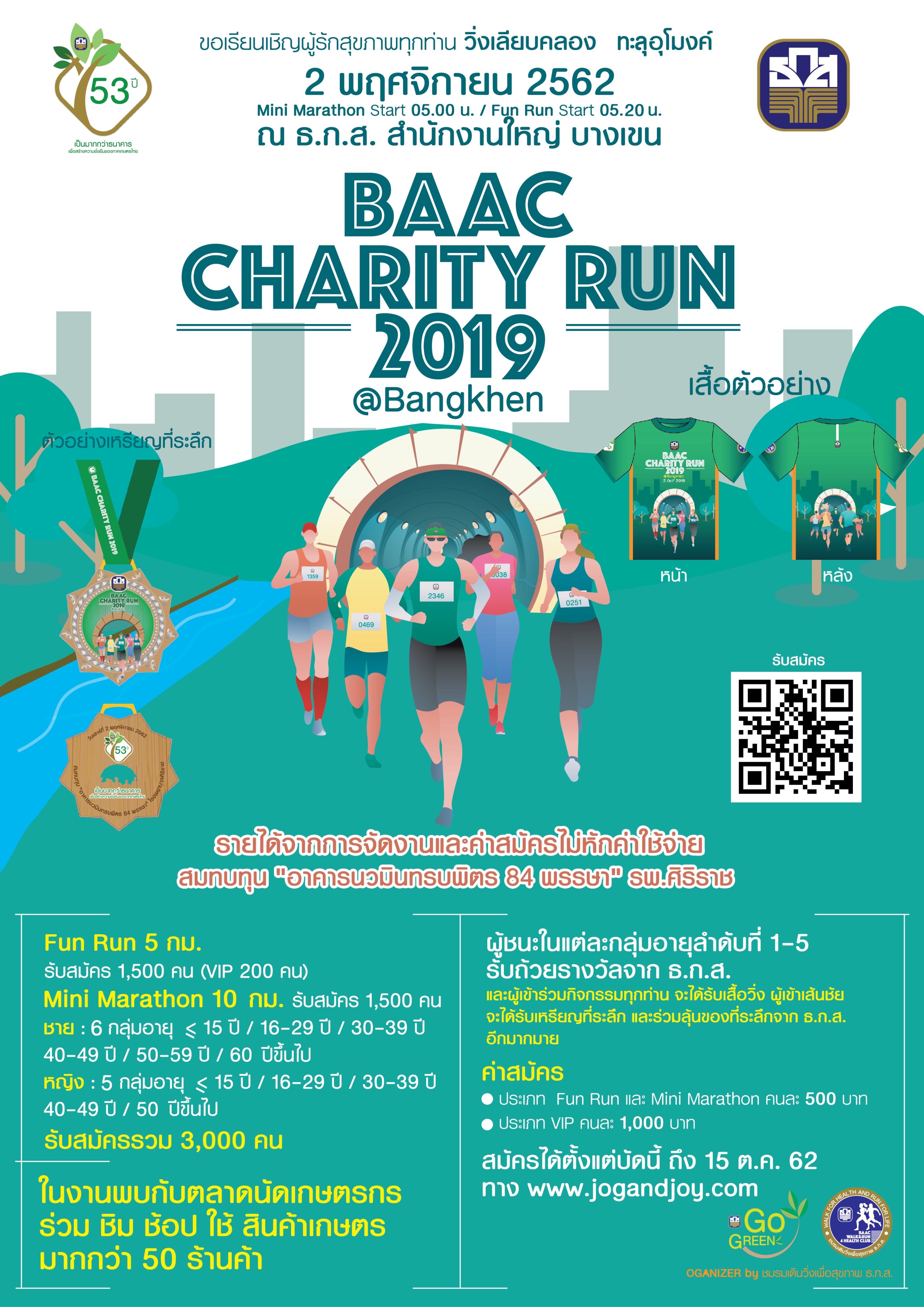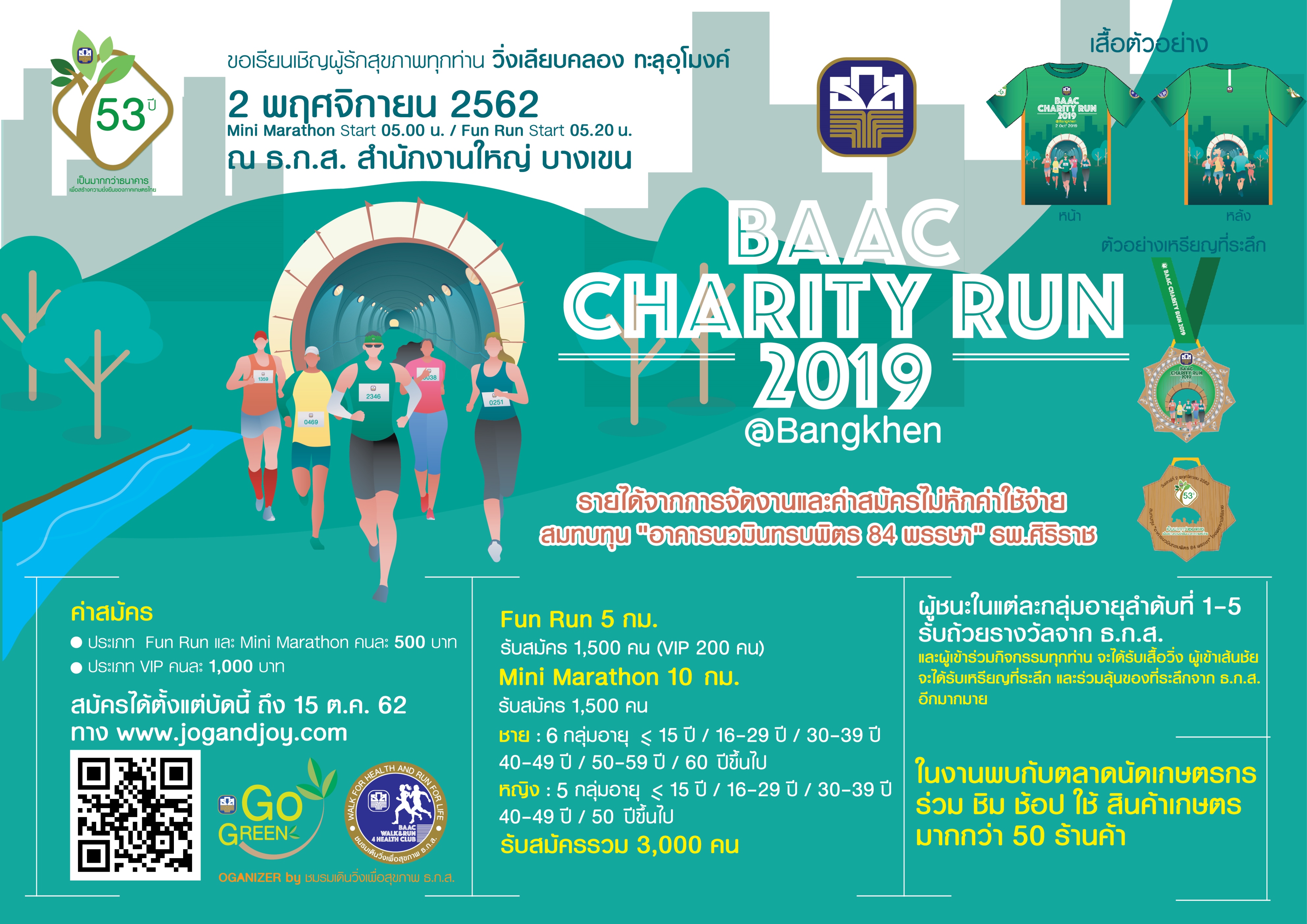 ส่วนผู้ชนะในแต่ละกลุ่มอายุลำดับที่ 1-5 จะได้รับถ้วยรางวัลและผู้เข้าเส้นชัยจะได้รับเหรียญที่ระลึก แถมยังได้ร่วมลุ้นรับของที่ระลึกจาก ธ.ก.ส. อีกมากมาย ผู้ที่สนใจสมัครได้ที่เว็บไซต์ www.jogandjoy.com ตั้งแต่บัดนี้ถึง 15 ตุลาคม 2562